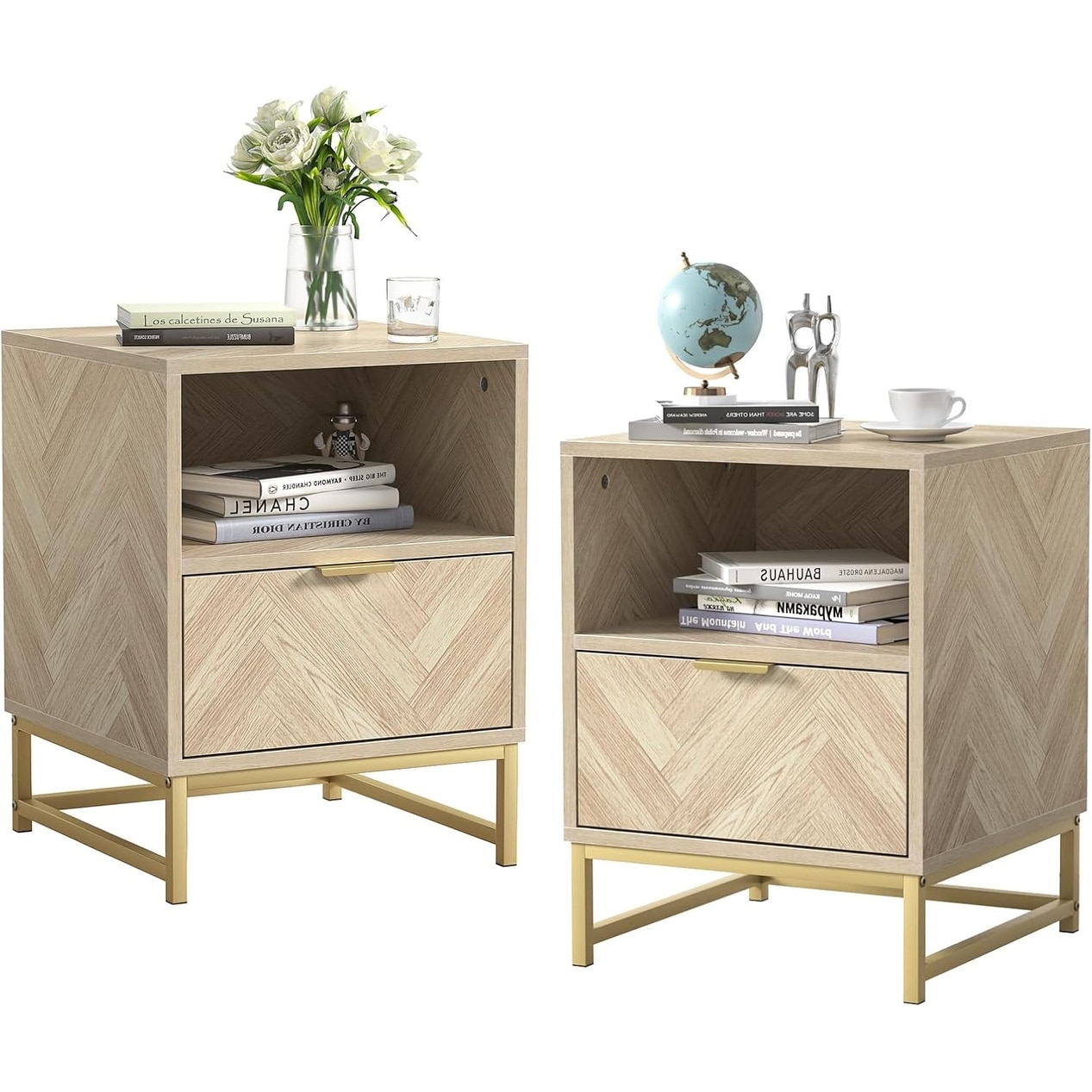 Modern Nightstand Set of 2 with Drawer, Shelf, Gold Handles, Natural Oak Finish