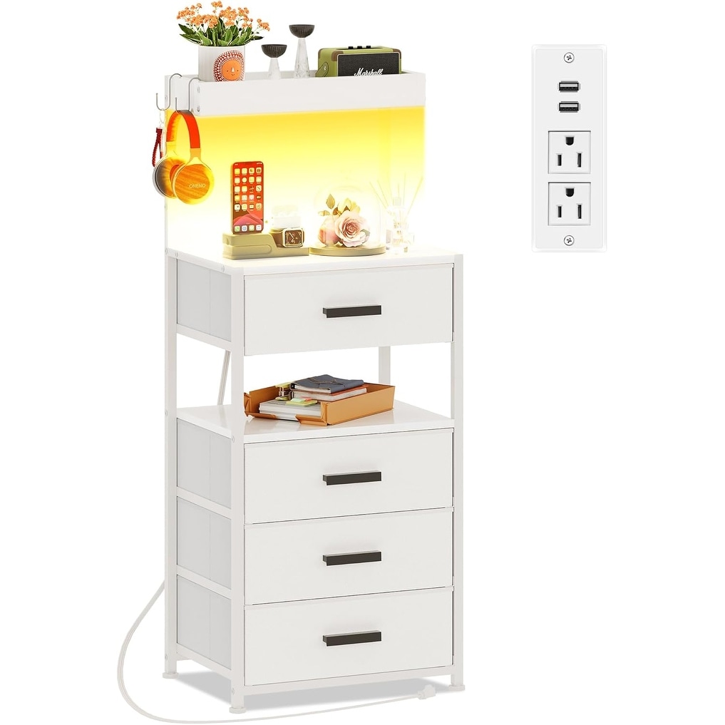 4-Drawer LED Nightstand with Charging Station, Fabric Storage Dresser for Bedroom, Living Room, Entryway, White