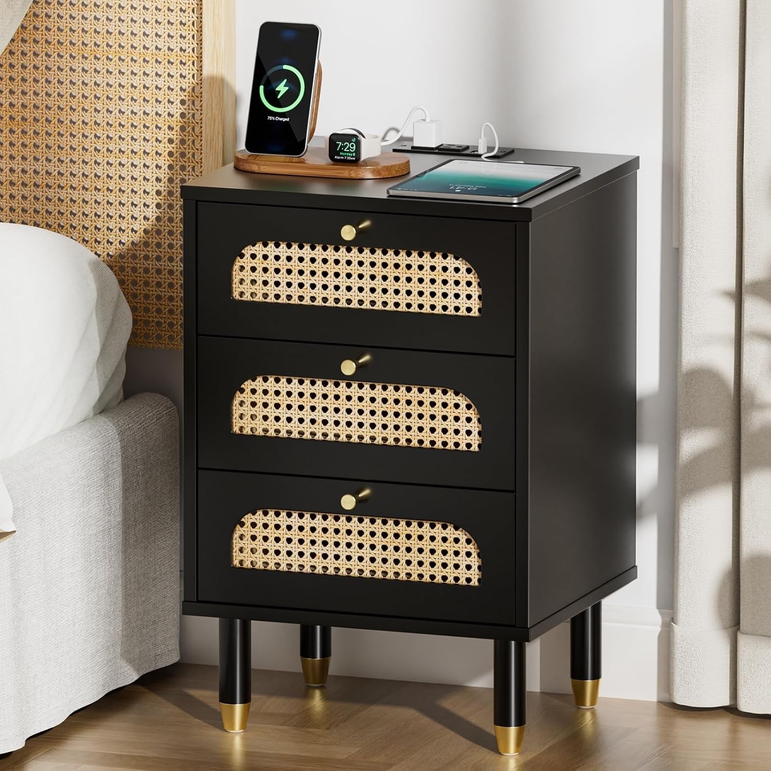 Modern Rattan Nightstand with Charging Station, 3 Drawers, Wooden Bedside Table, Boho Style