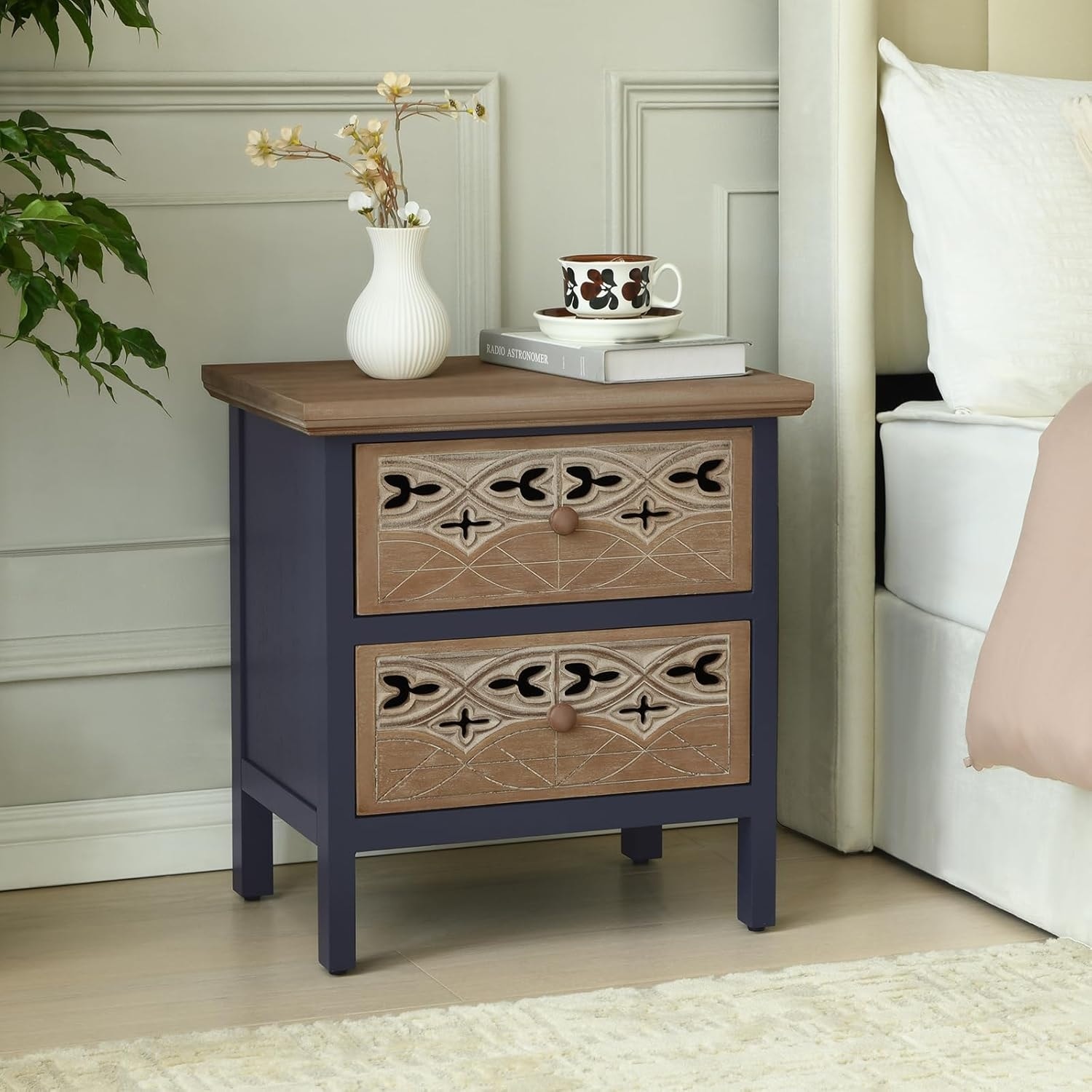 Modern Solid Wood Nightstand with Carved Drawer, Small Side Table for Bedroom and Living Room