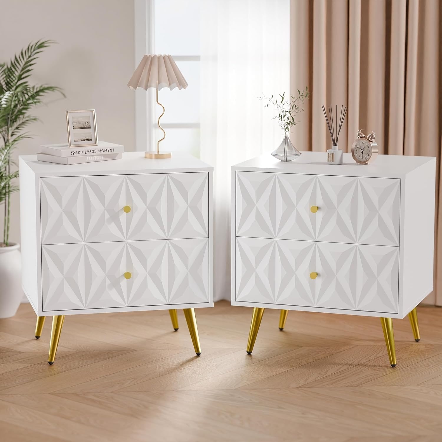 Modern White and Gold Nightstand Set of 2 with Drawers, Wide Storage Bedside Table with Geometric Design and Metal Legs