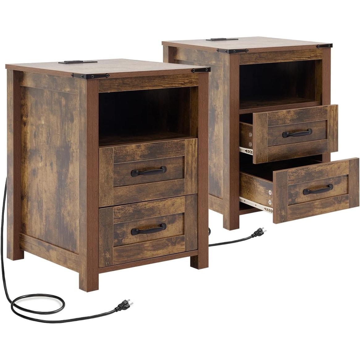Set of 2 Rustic Night Stands with Charging Station, Farmhouse Bedside Tables with Drawers and Open Shelf