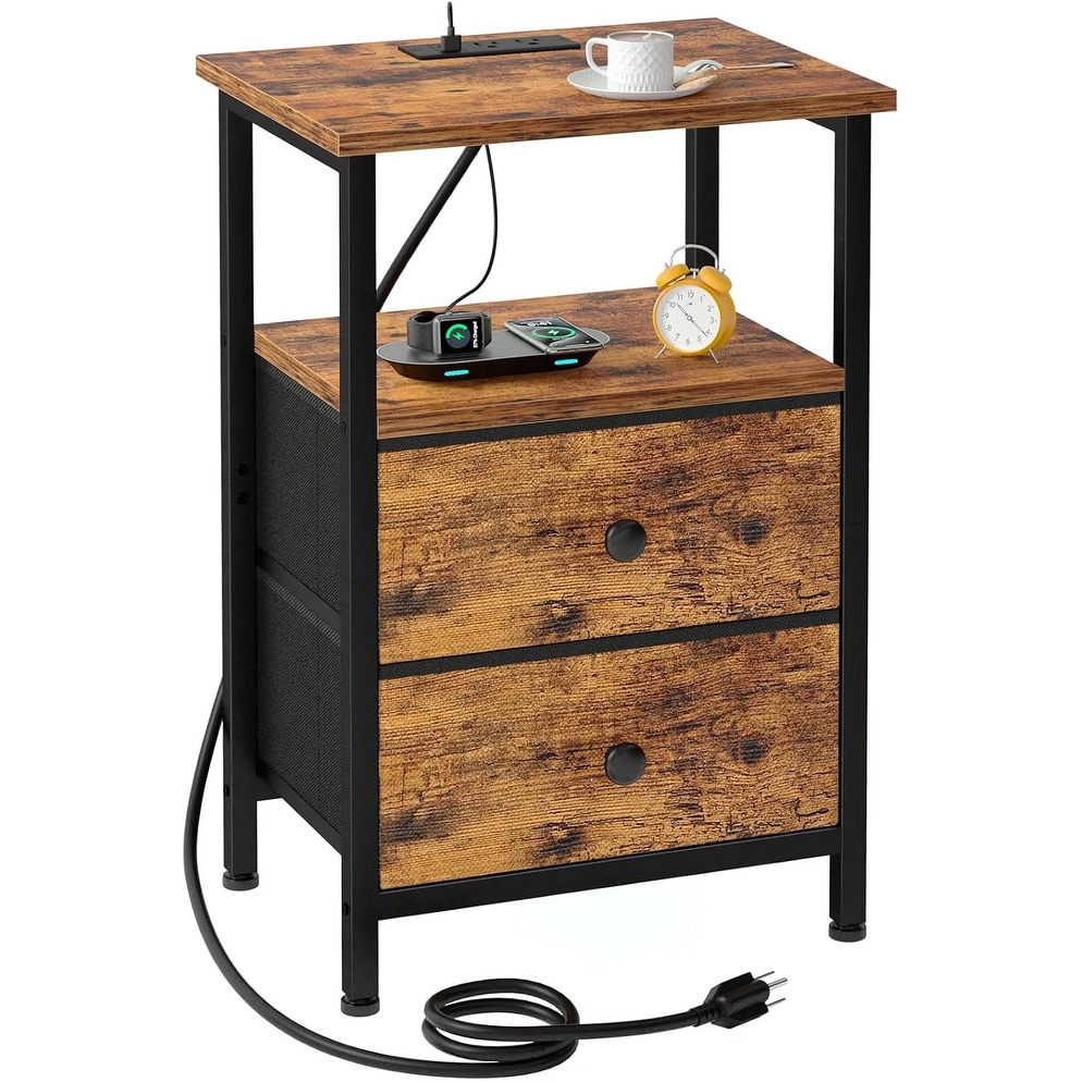 Compact Nightstand with Charging Station, Storage Drawers, and Adjustable Feet for Bedroom or Living Room