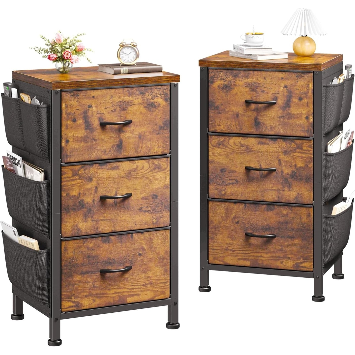 Set of 2 Nightstands with Fabric Drawer, Mesh Shelf, and Metal Frame, Rustic Brown