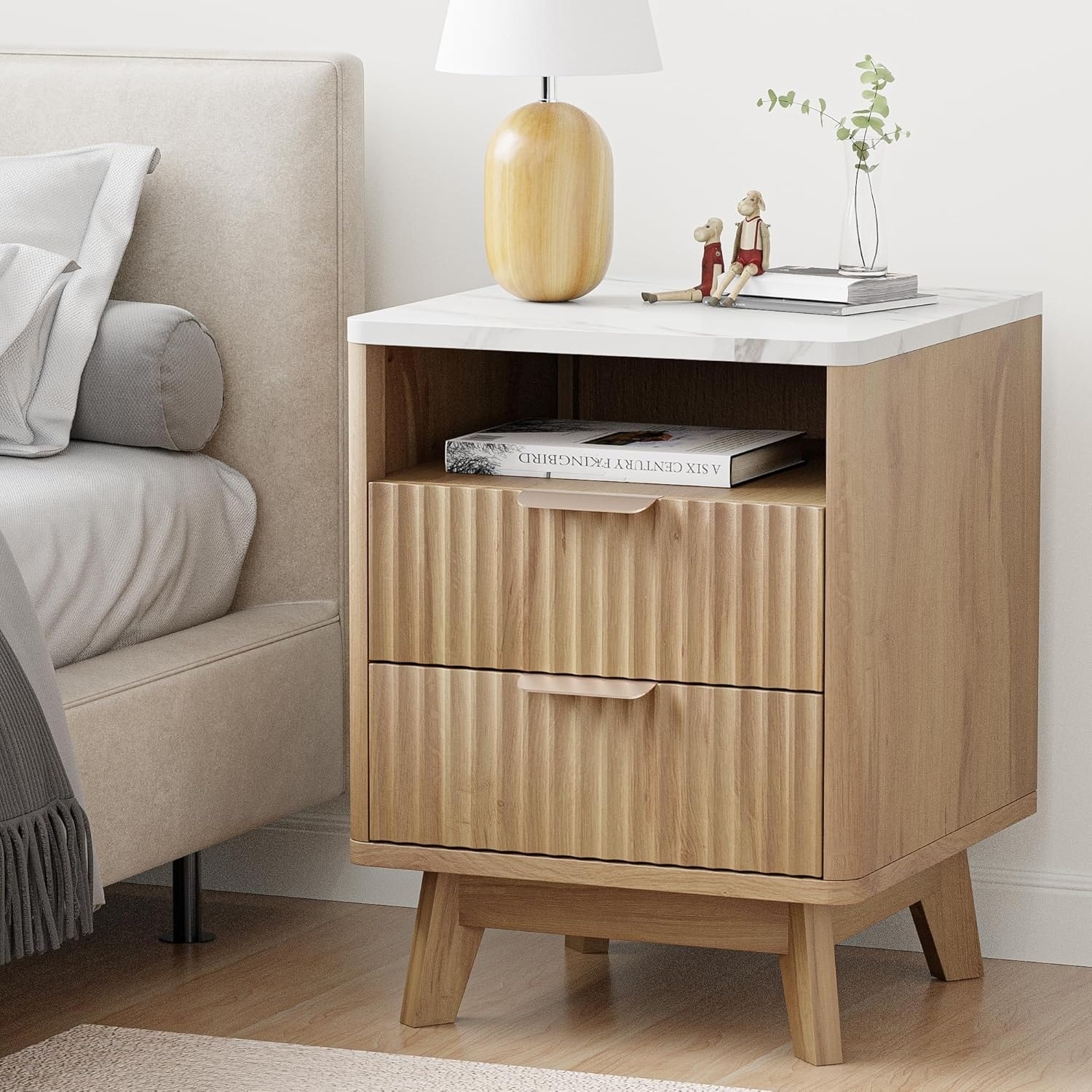 Modern Fluted Nightstand with Faux Marble Top, 2 Drawers, Open Shelf, Natural Oak Finish