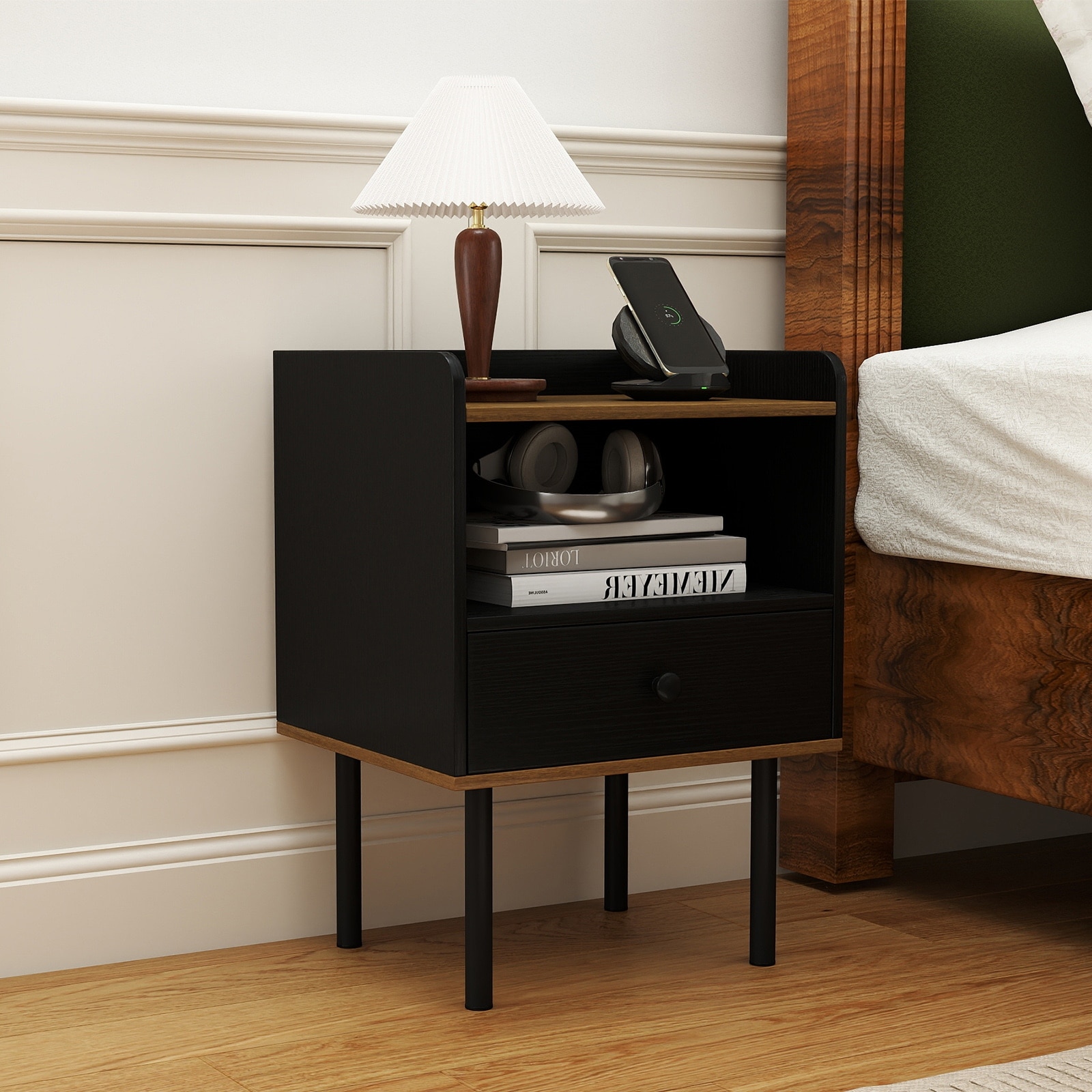 3-Tier Modern Nightstand with Drawer & Open Shelf, Raised Metal Legs, and Sturdy Construction