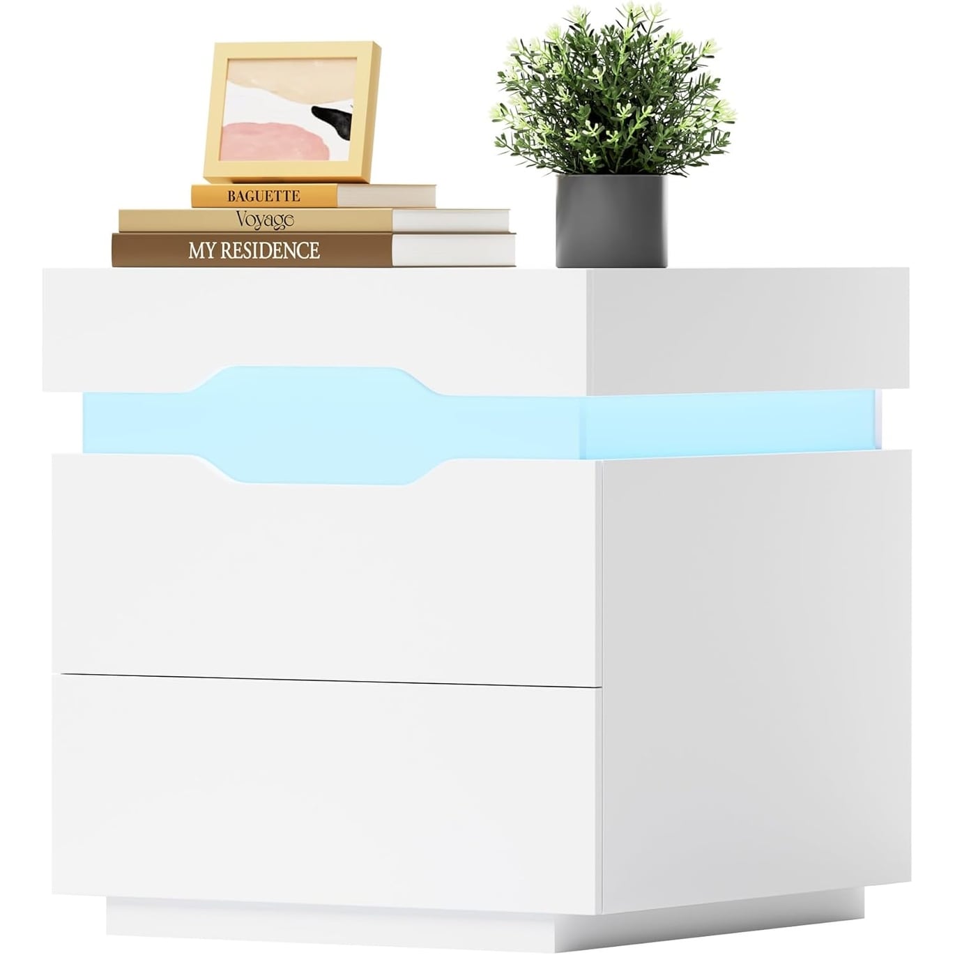 LED Nightstand with Charging Station, Drawers, Sliding Top, White