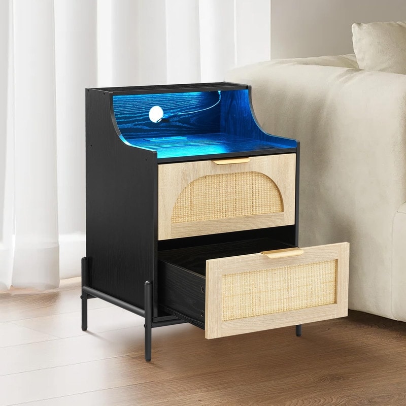 Rattan Nightstand with 2 Drawers, Modern Bedside Table, Wood End Table