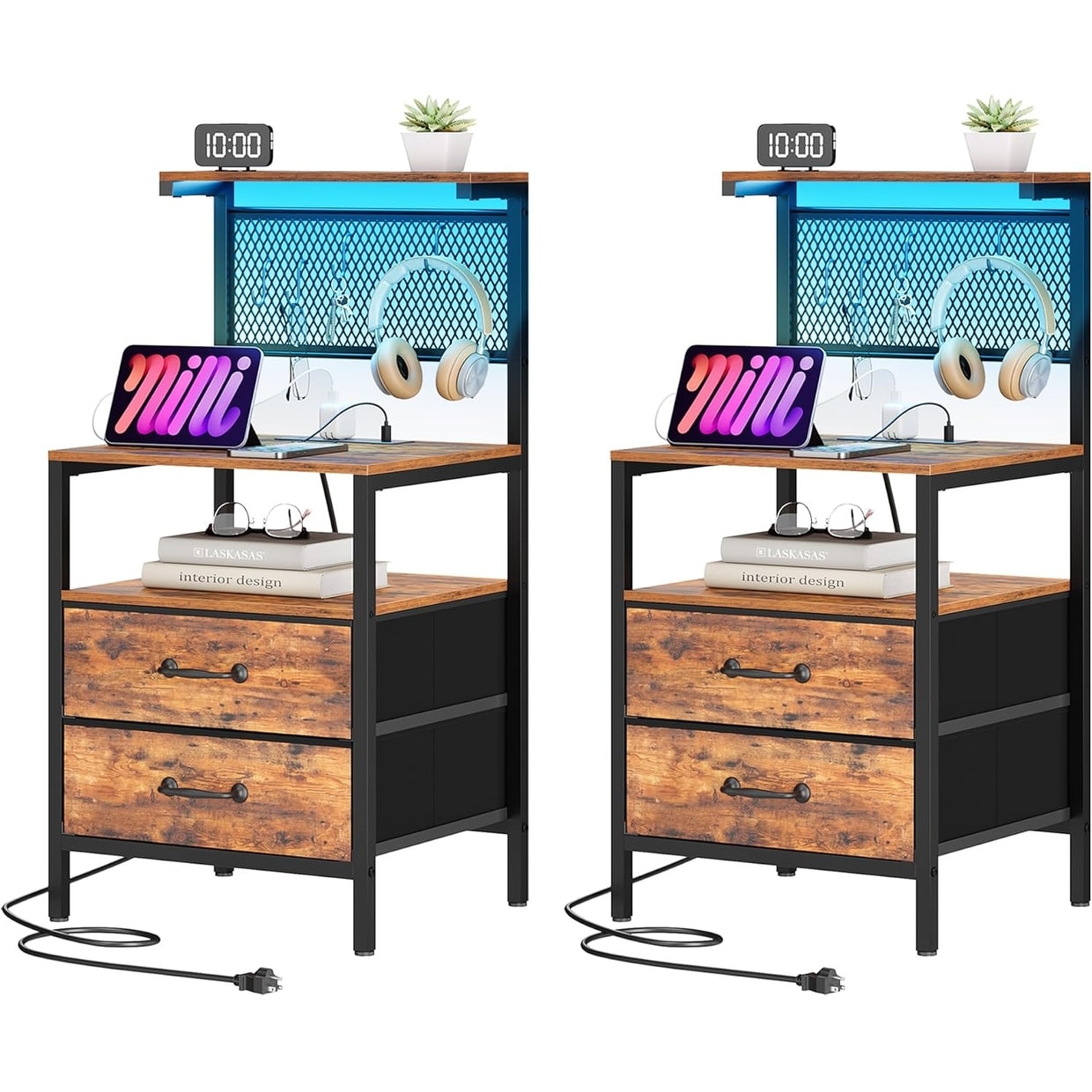2 Pack Modern Nightstand with Charging Station, Bedside Tables with LED Light and Fabric Drawers