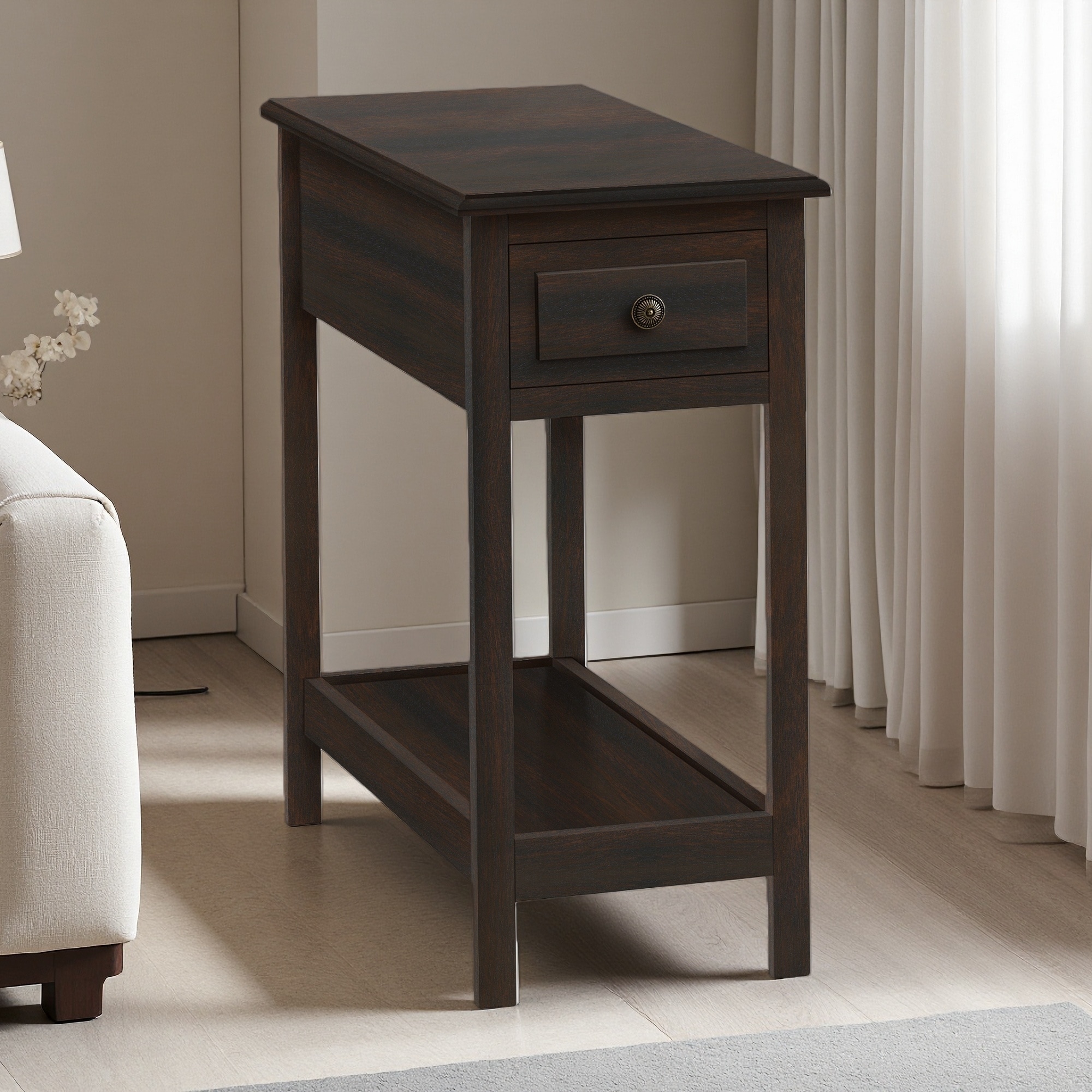 11.75"L Walnut 2-Tier Accent Table with Storage Drawer, Bottom Shelf, and Bronze Knob