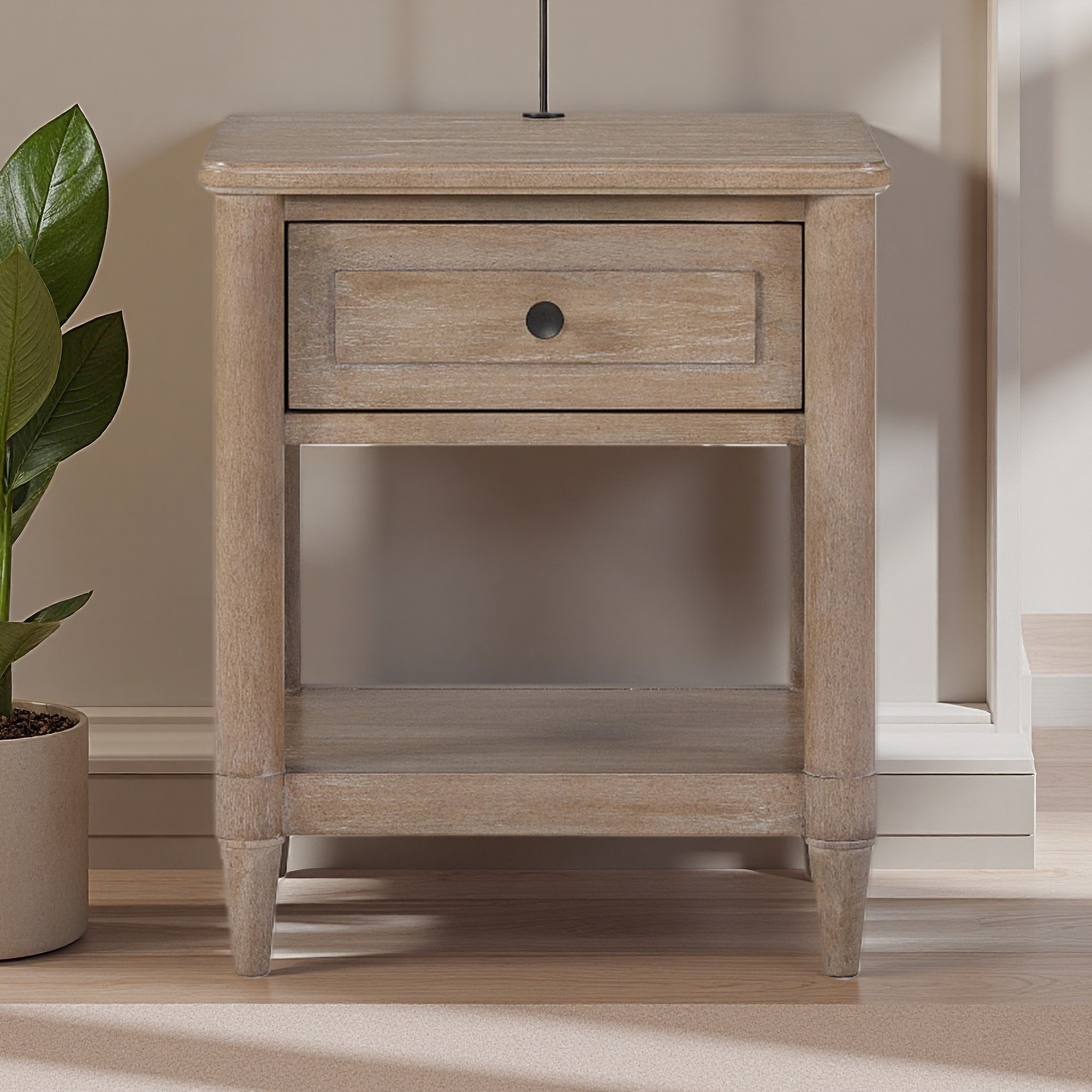 22"L Small Teen Nightstand with Mindi Veneer, USB Charging Port, 1 Drawer & Open Shelf, Compact Bedroom Accent Table