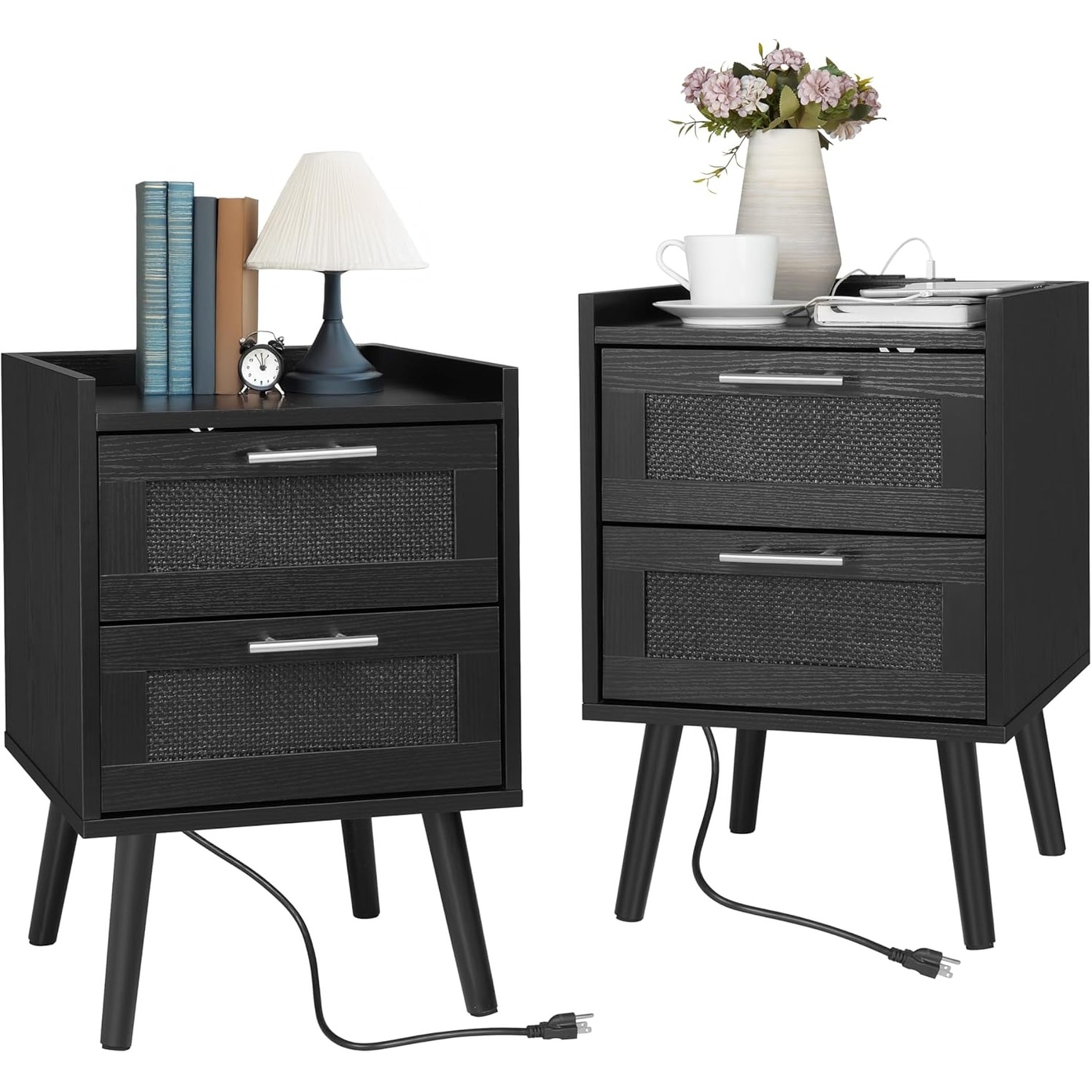 Modern Nightstand with Charging Station, 2 Drawers, Black Rattan Design, Set of 2