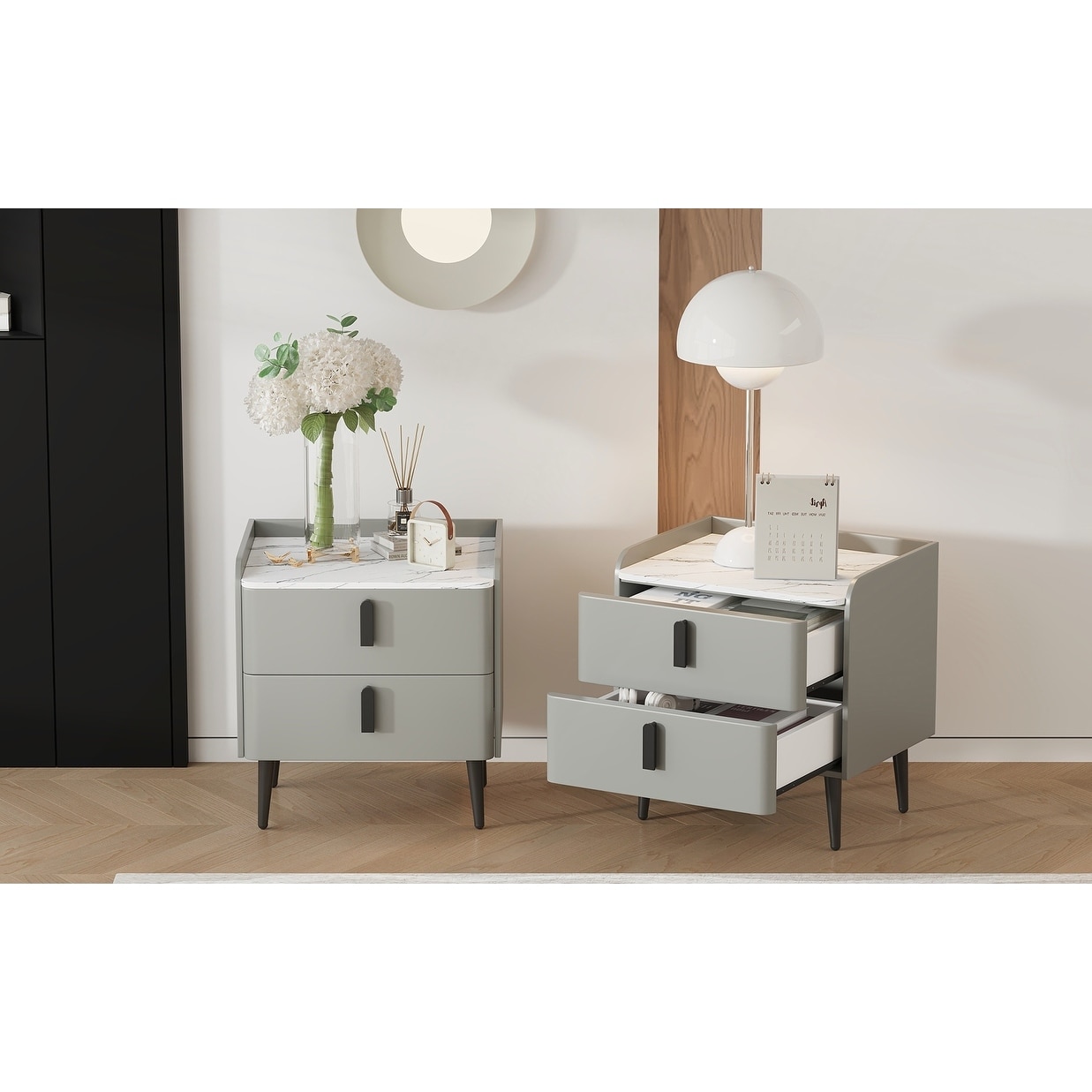 Modern White Nightstand with 2 Drawers and Marble-Pattern Tabletop for Bedroom and Living Room Organization