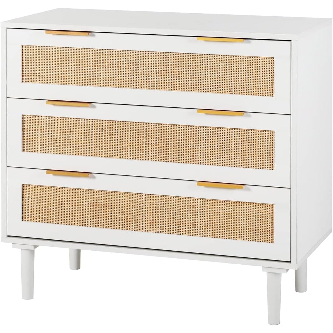 Modern 3-Drawer Nightstand with Rattan Design, Wooden Bedside Table for Queen and King Size Beds