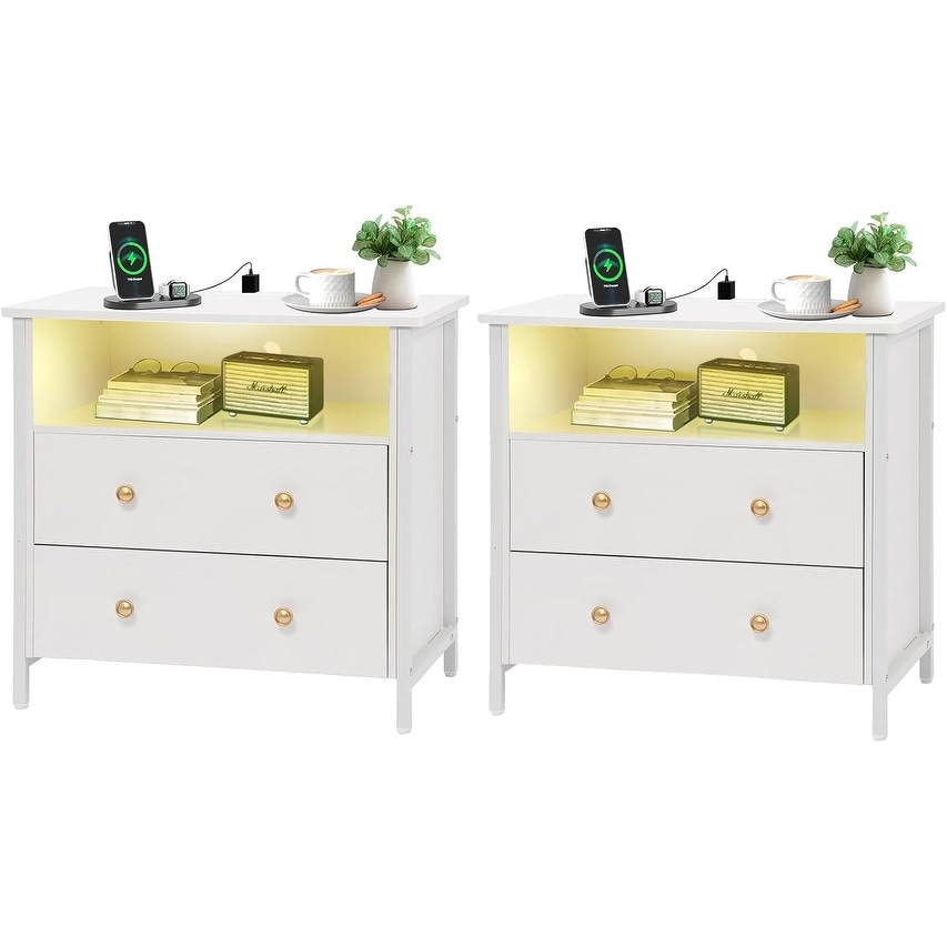 27 Inch Wide LED Night Stand with Charging Station, 2 Drawers, Adjustable Feet, White