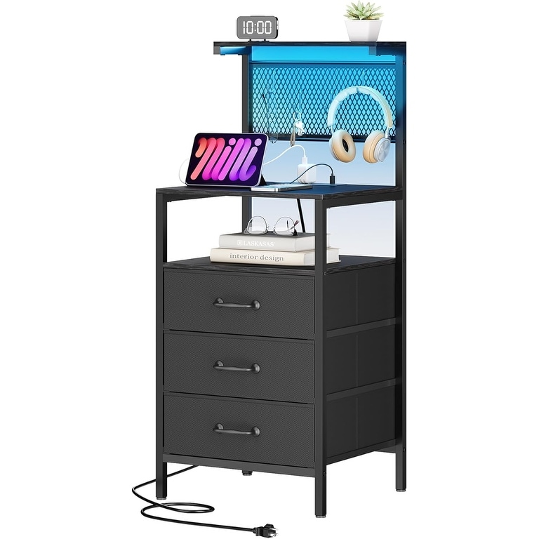Modern LED Nightstand with USB Charging Station, 3 Fabric Drawers & Storage Shelves, Adjustable Color Lighting, Black