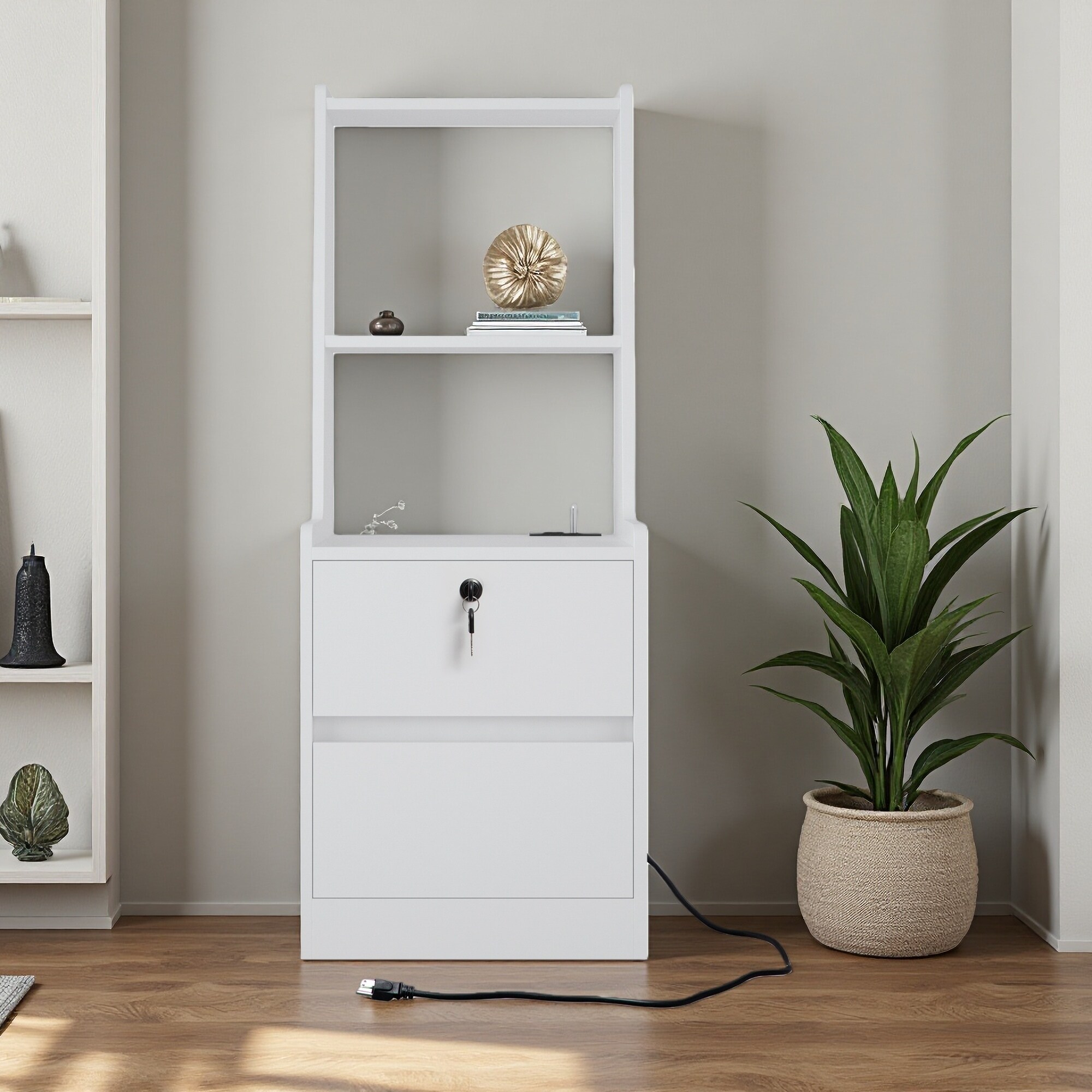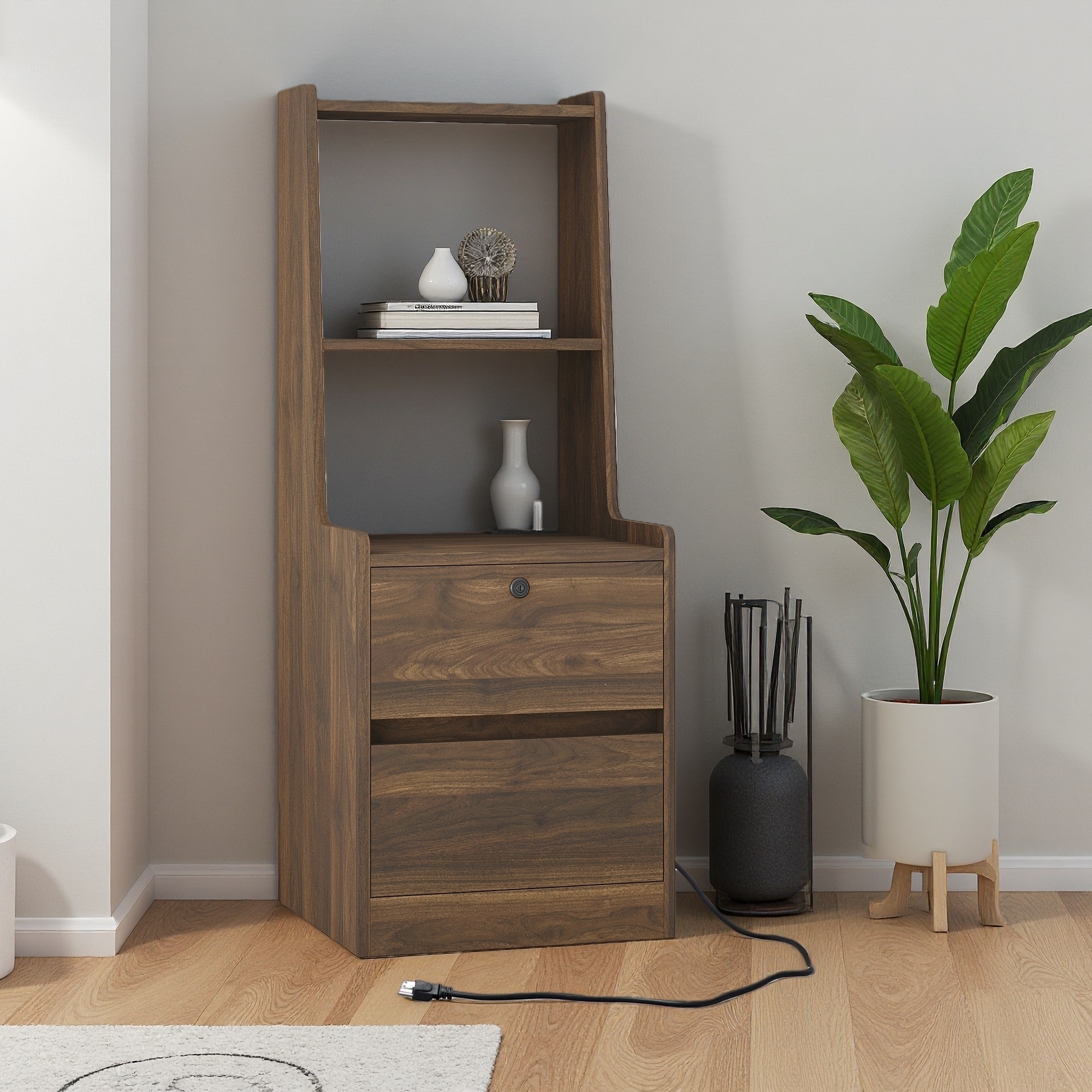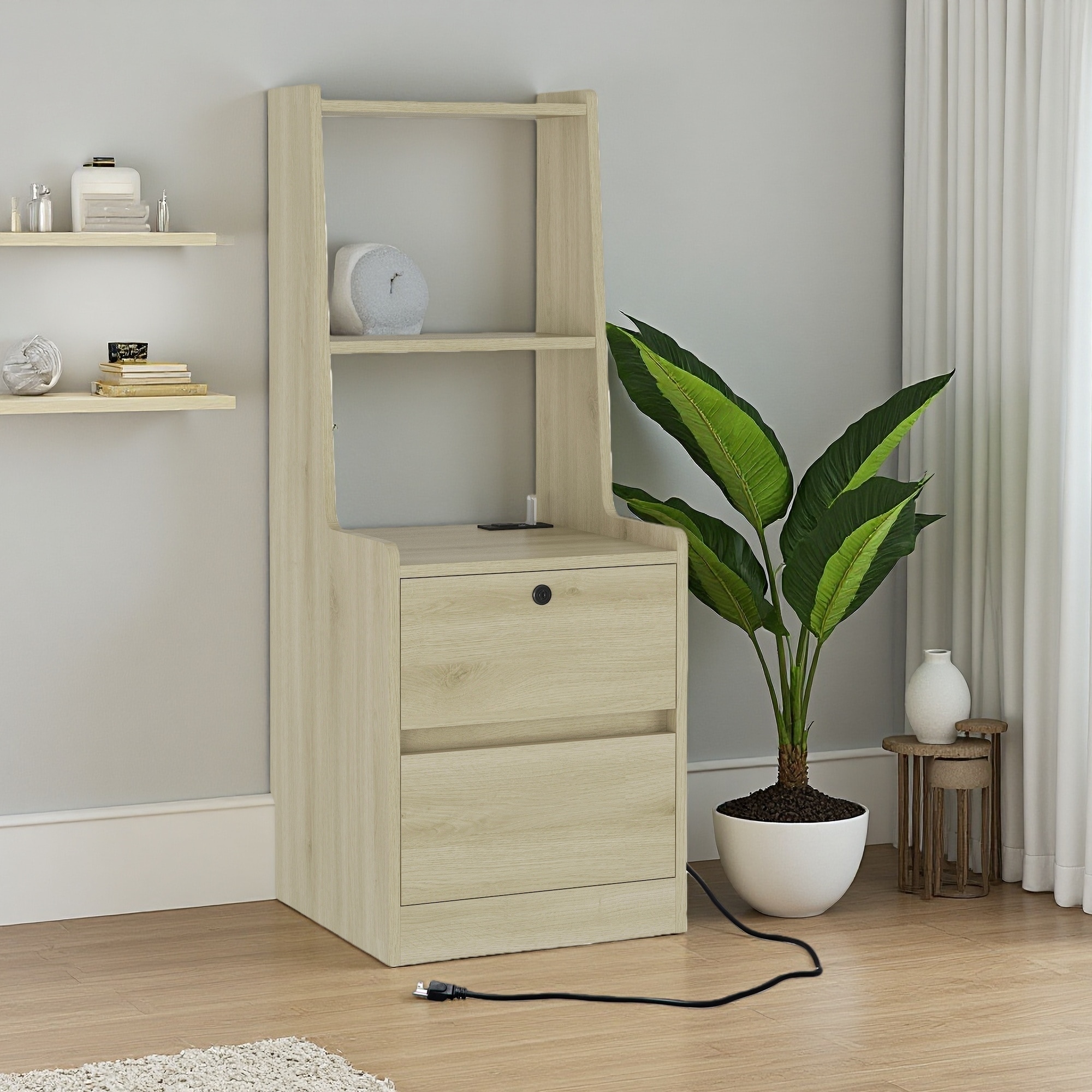 41.14"H Wooden Nightstand with Voice-Controlled Light, Charging Station, AC Outlet & USB Ports, Bookshelf and Lockable Storage
