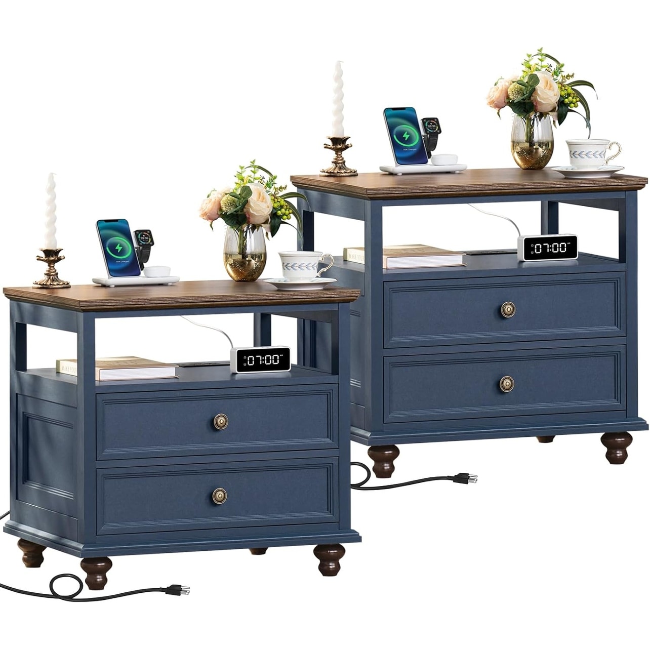 Farmhouse Nightstand Set of 2 with Charging Station, 24 Inch Wide End Table with 2 Drawers, Navy Blue