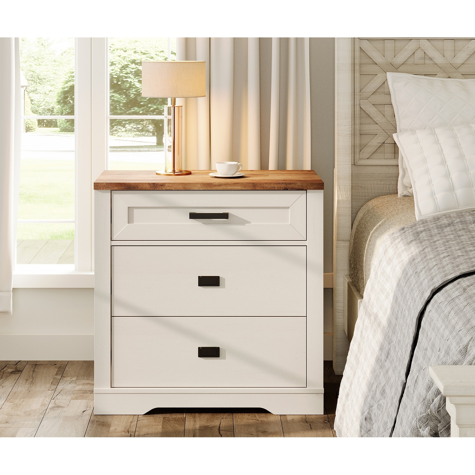 Cherry Nightstand 25x19x15 Compact Transitional Bedside Table with Three Storage Drawers and Clean Modern White Finish