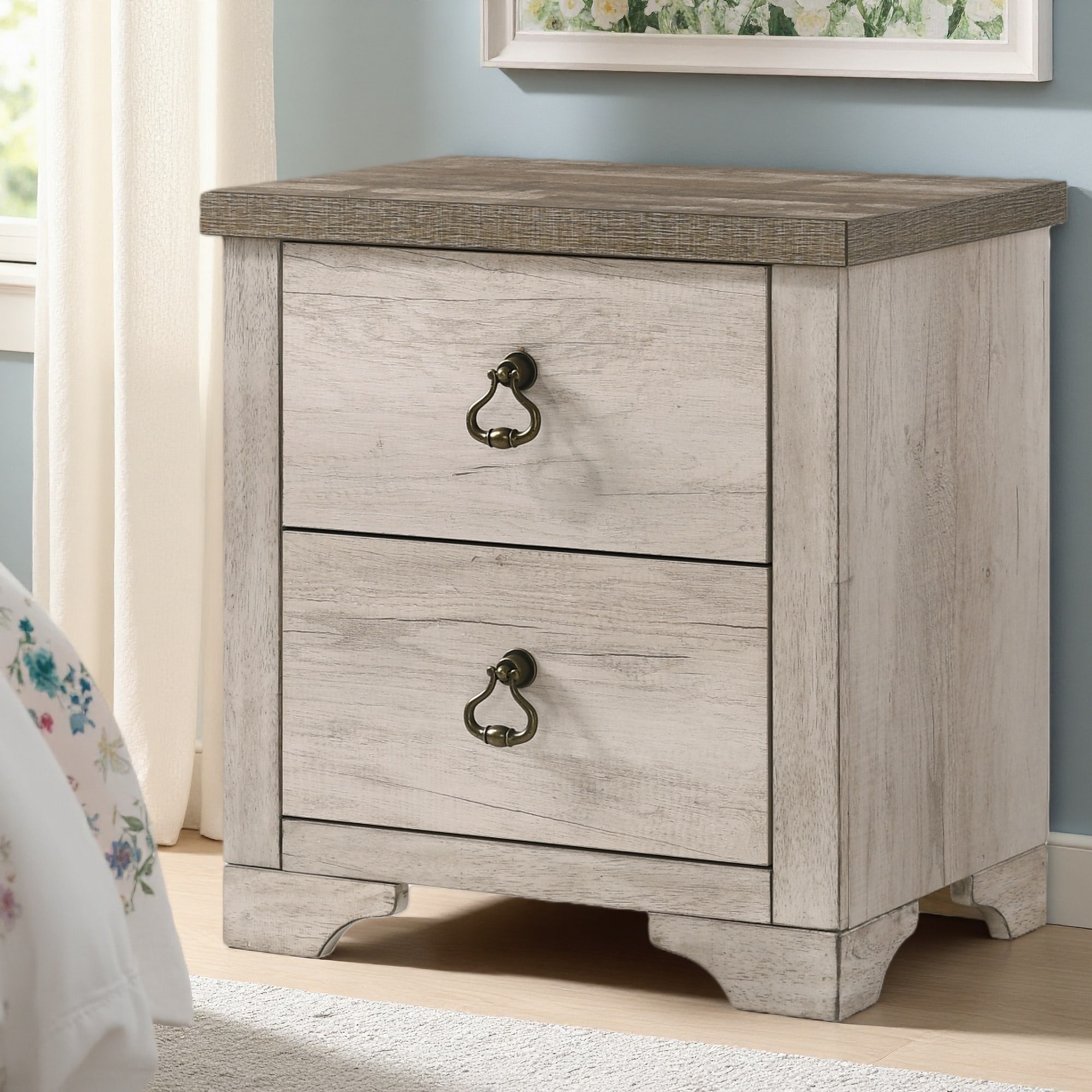 23.6"L Wood Cottage Style Distressed 2-Drawer Bedroom Nightstand with Driftwood Finish, Weathered Finish Top, Ring Pull Hardware