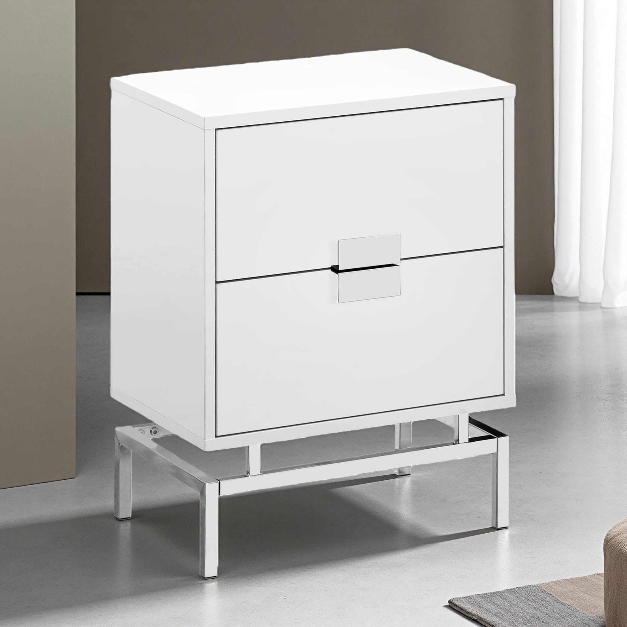 18.25"L Rectangular Glossy Accent Table with Two Storage Drawers, Chrome Metal Base, Retro-Inspired Nightstand for Bedroom