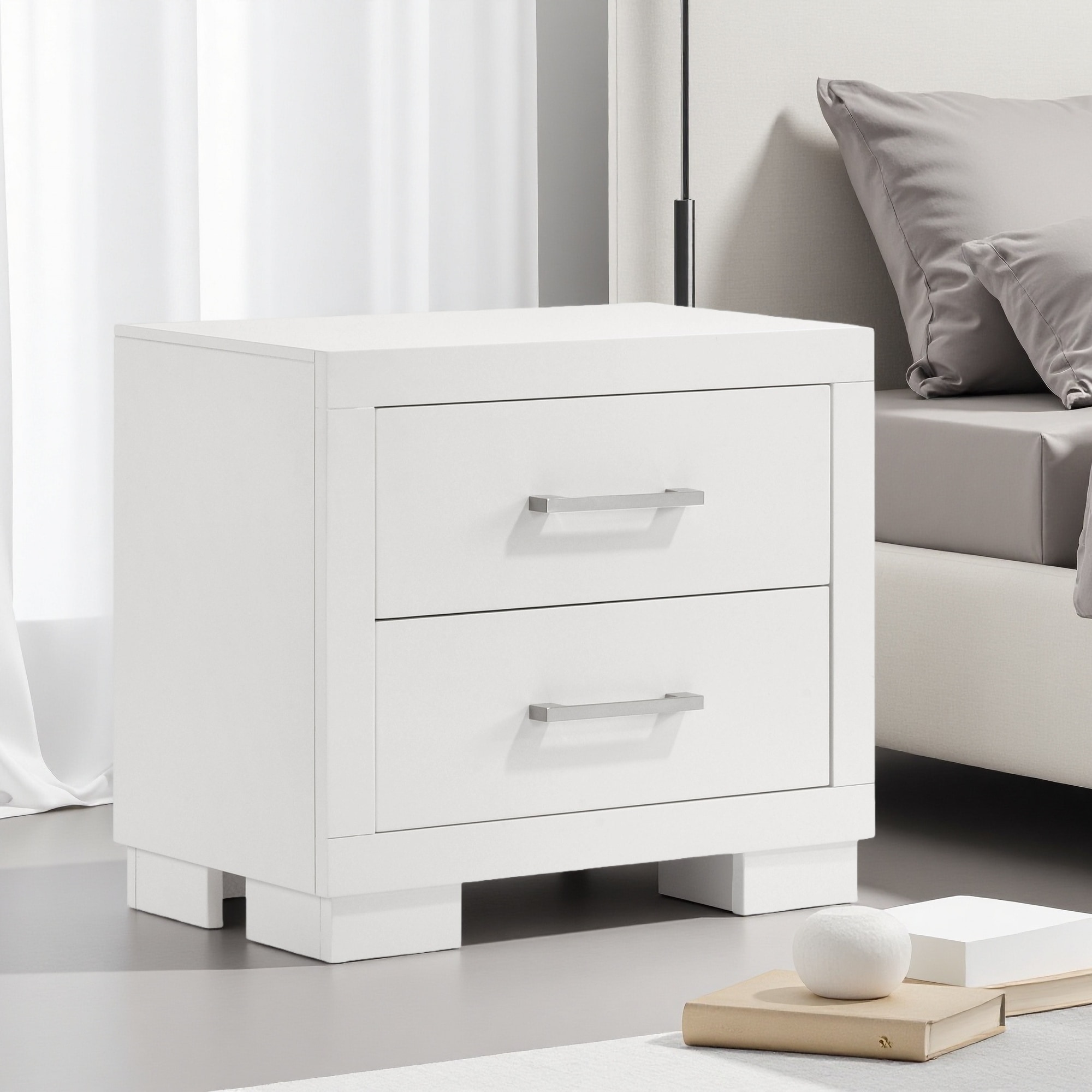 26"L Asian Hardwood & MDF 2-Drawer Rectangular Nightstand with Bar Handle Pulls, Clean Modern Bedside Table