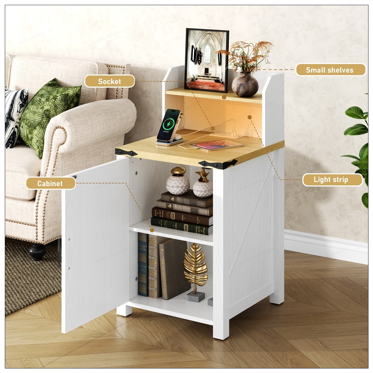 LED Nightstand with Charging Station, Sofa Side Table with 2 Drawers & Extended Bookshelf, Multi-functiona Entryway Table