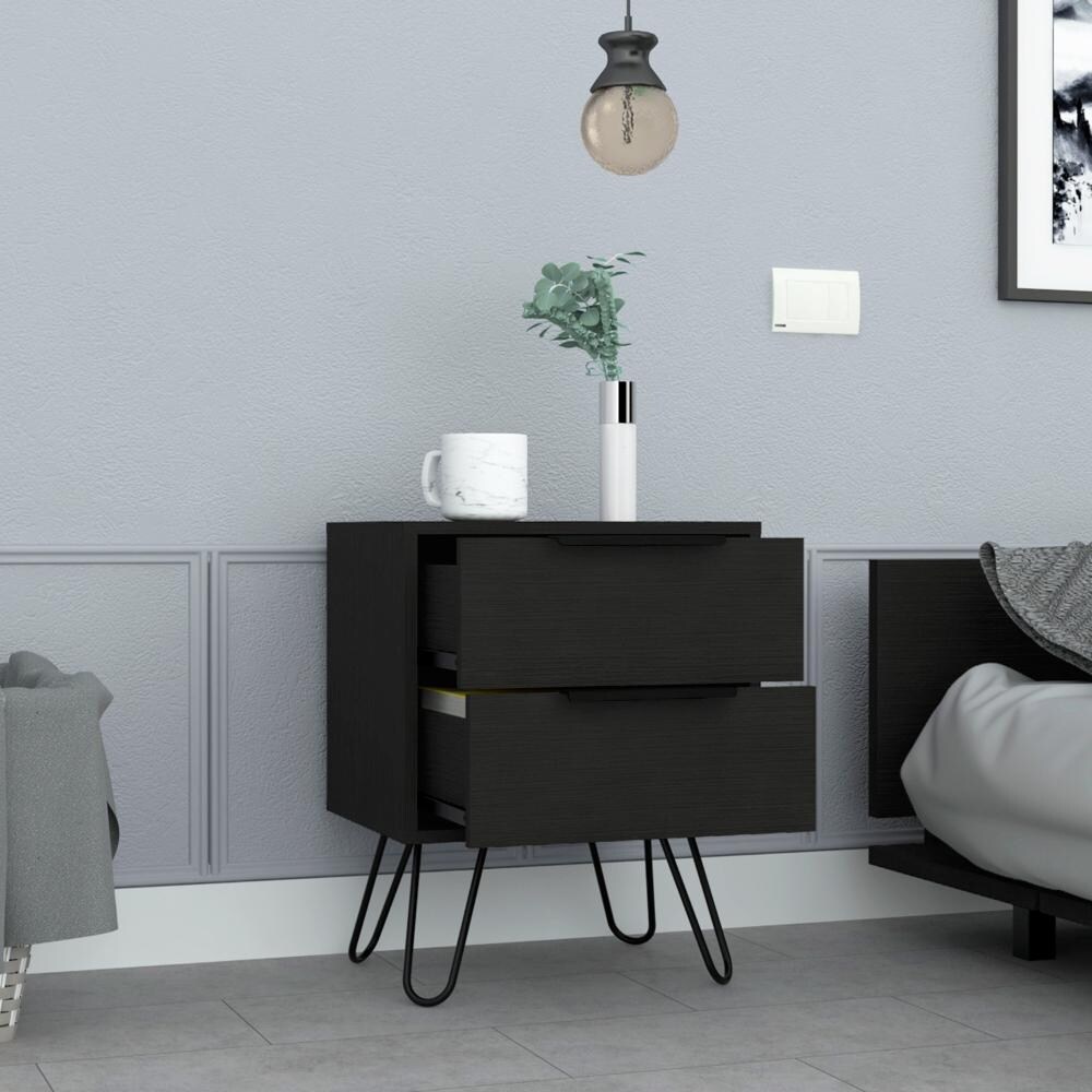 2 Nightstand, Hairpin Legs, Two Drawers, Black