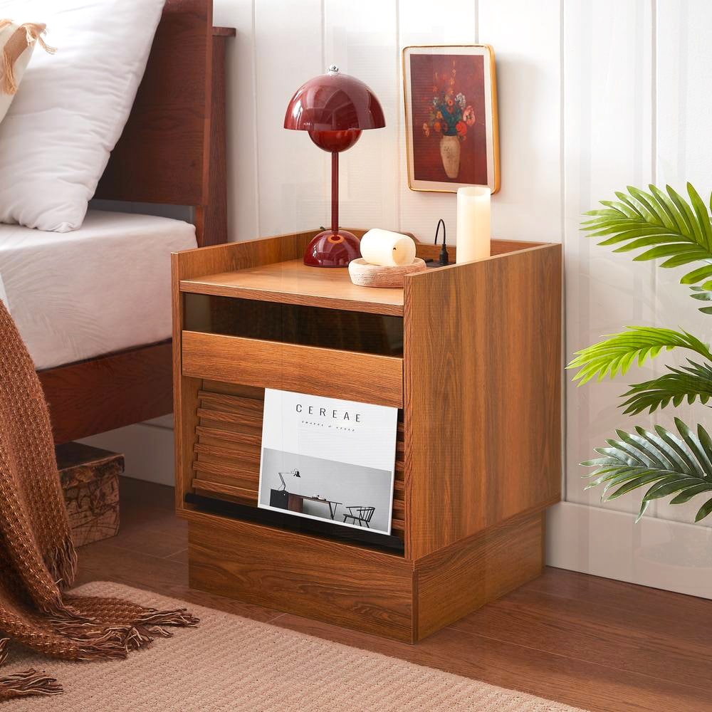 Mid-Century Modern Nightstand with Charging Station & LED Lights