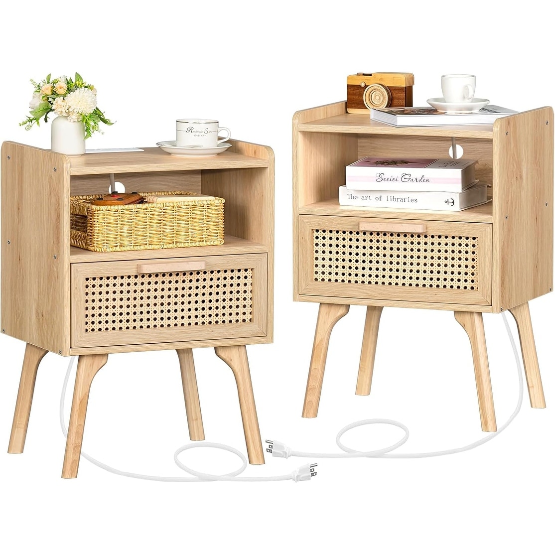 Set of 2 Rattan Nightstands with Charging Station, Drawer, Open Shelf, and Solid Wood Legs for Bedroom and Small Spaces