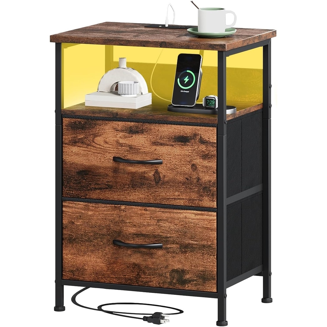 2-Drawer Nightstand with Charging Station, LED Light, and Fabric Bins for Bedroom, Dorm, or Entryway