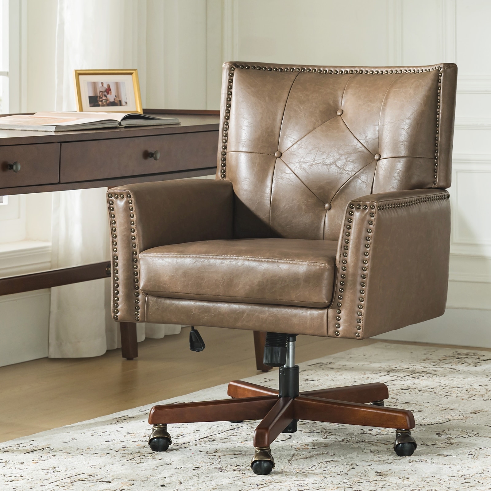 HULALA HOME Meroy Transitional Faux Leather Swivel Solid Wood Office Chair with Reclining Backrest and Adjustable Height