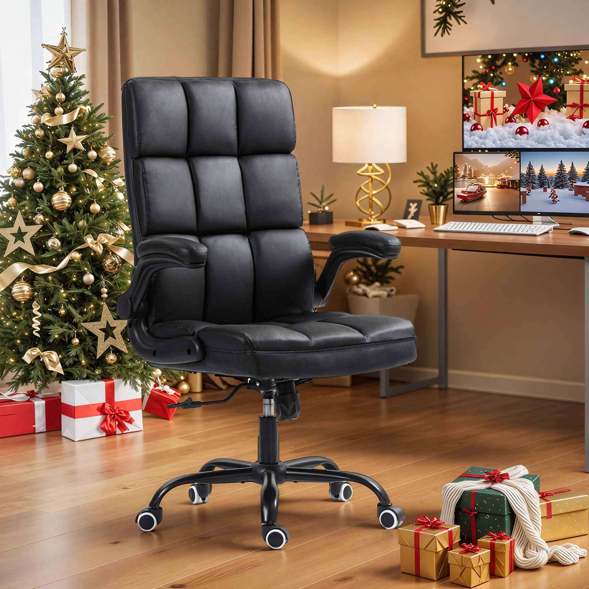 EROMMY Mid-Century Modern Leather Office Chair with Wheels, Ergonomic Rolling Desk Chair, Flip-Up Arms.