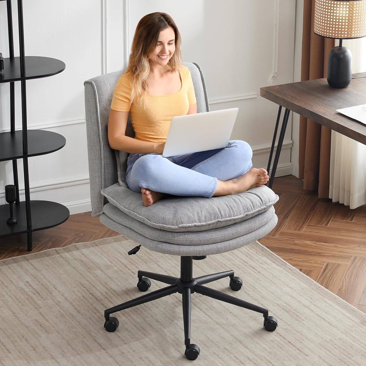 Armless Cross Legged Office Desk Chair with Swivel, Height Adjustable, Wide Seat, Fabric Padded, Modern Design for Home Office