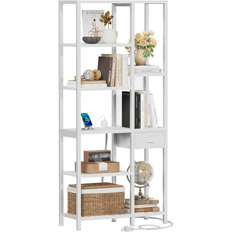 Modern 6-Tier Bookshelf with USB Ports, Power Outlets, and Drawer for Bedroom, Living Room, or Home Office