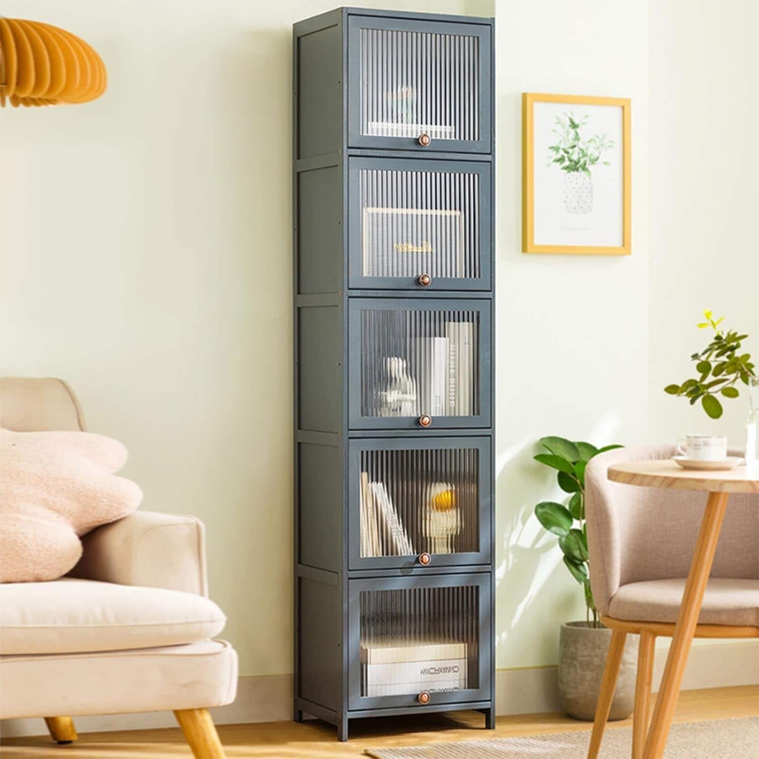 5-Tier Bamboo Bookcase with Clear Doors, Freestanding Storage Cabinet for Living Room