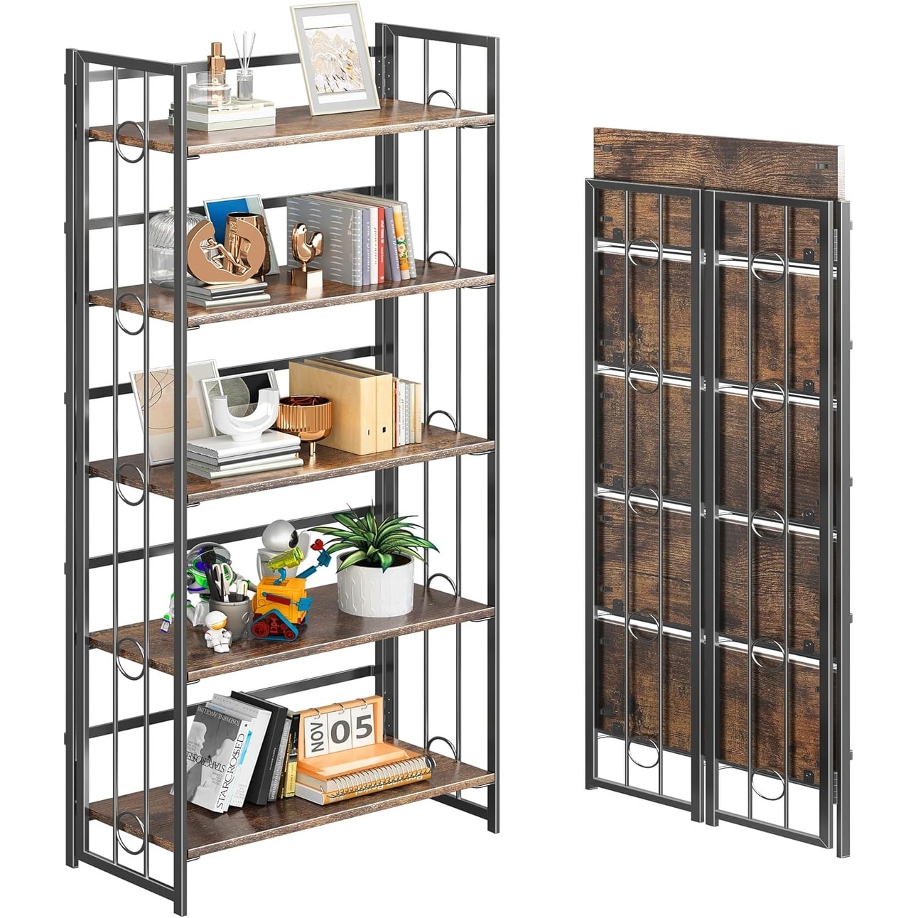 5-Tier Foldable Bookshelf, 59.4 Inch H, Rustic Brown Black, No Assembly Needed, Space-Saving Design
