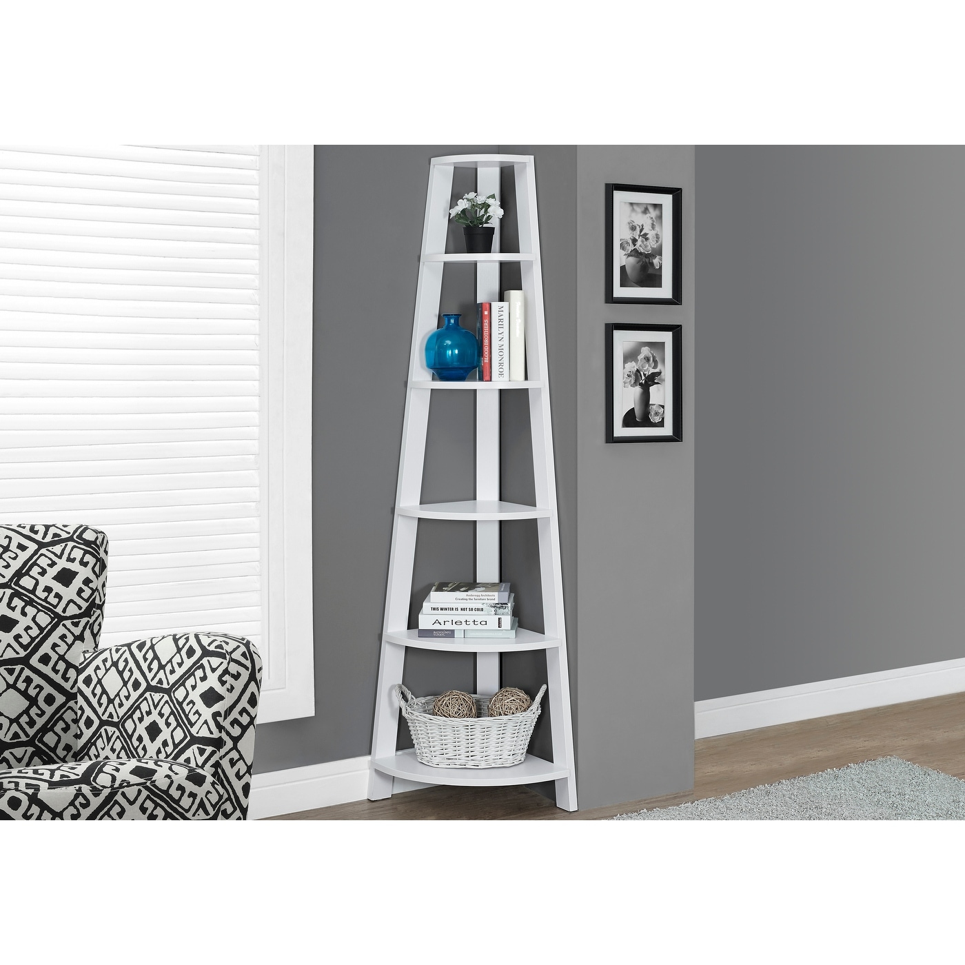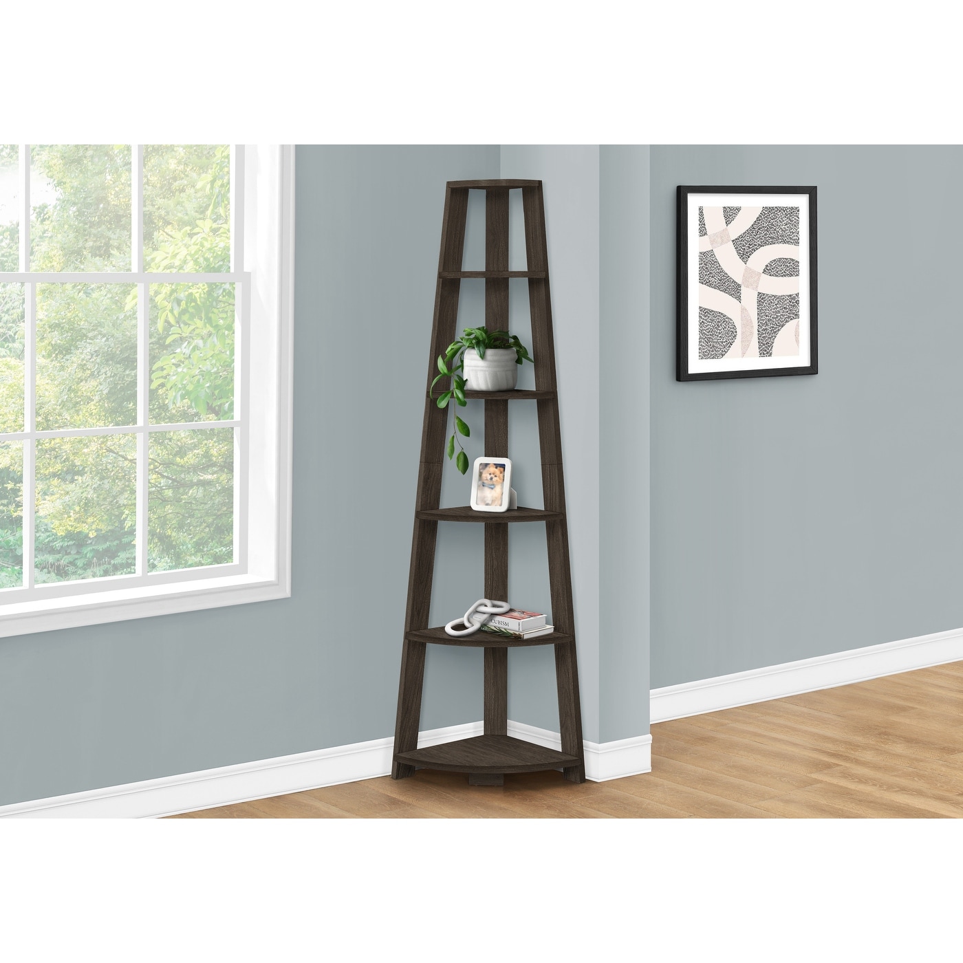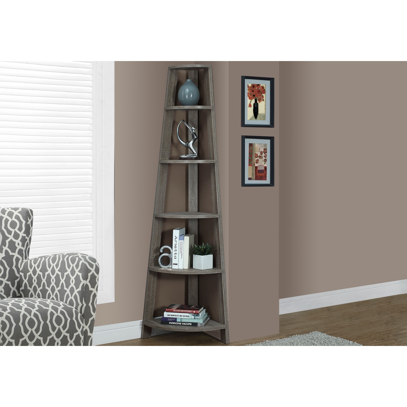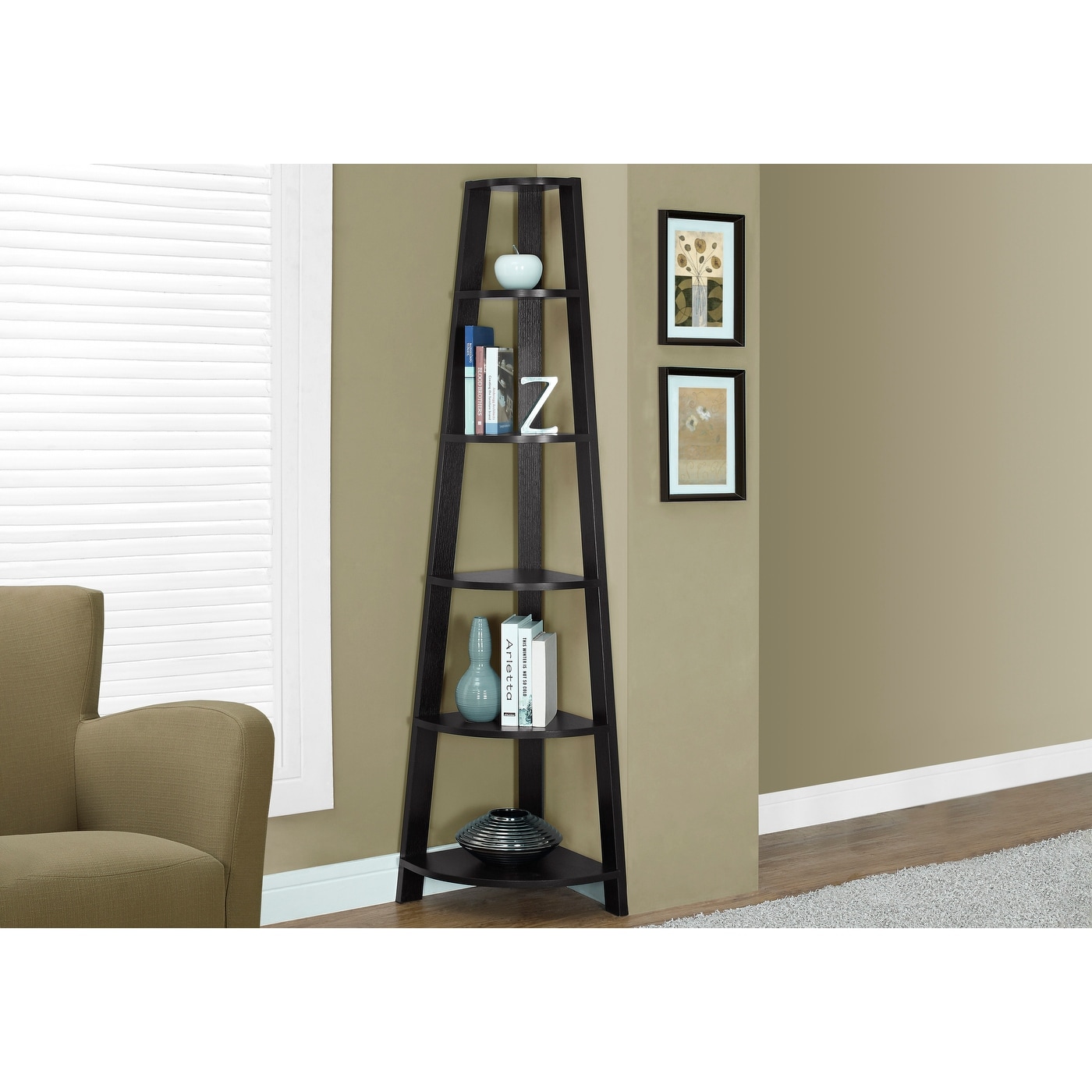 Bookshelf, Bookcase, Etagere, Corner, 5 Tier, 72"h, Office, Bedroom, Brown Laminate, Contemporary, Modern