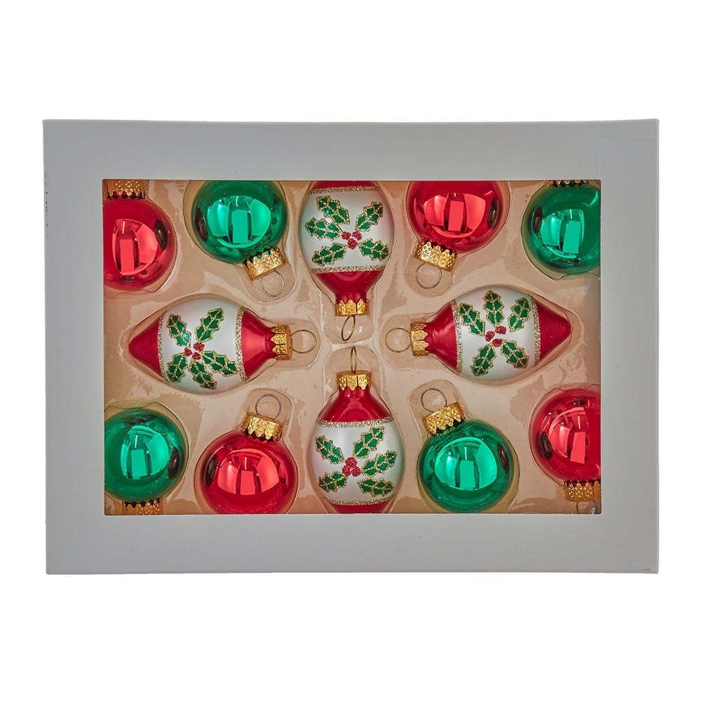 Kurt Adler 35MM Glass Green and Red Ball and Finial 12-Piece Ornament Set