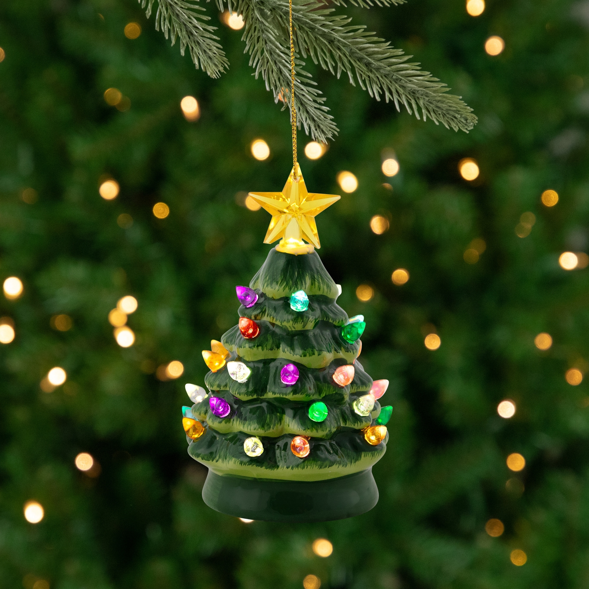 LED Lighted Mini Retro Christmas Tree with Gold Star Ornament - 5.25" - Green