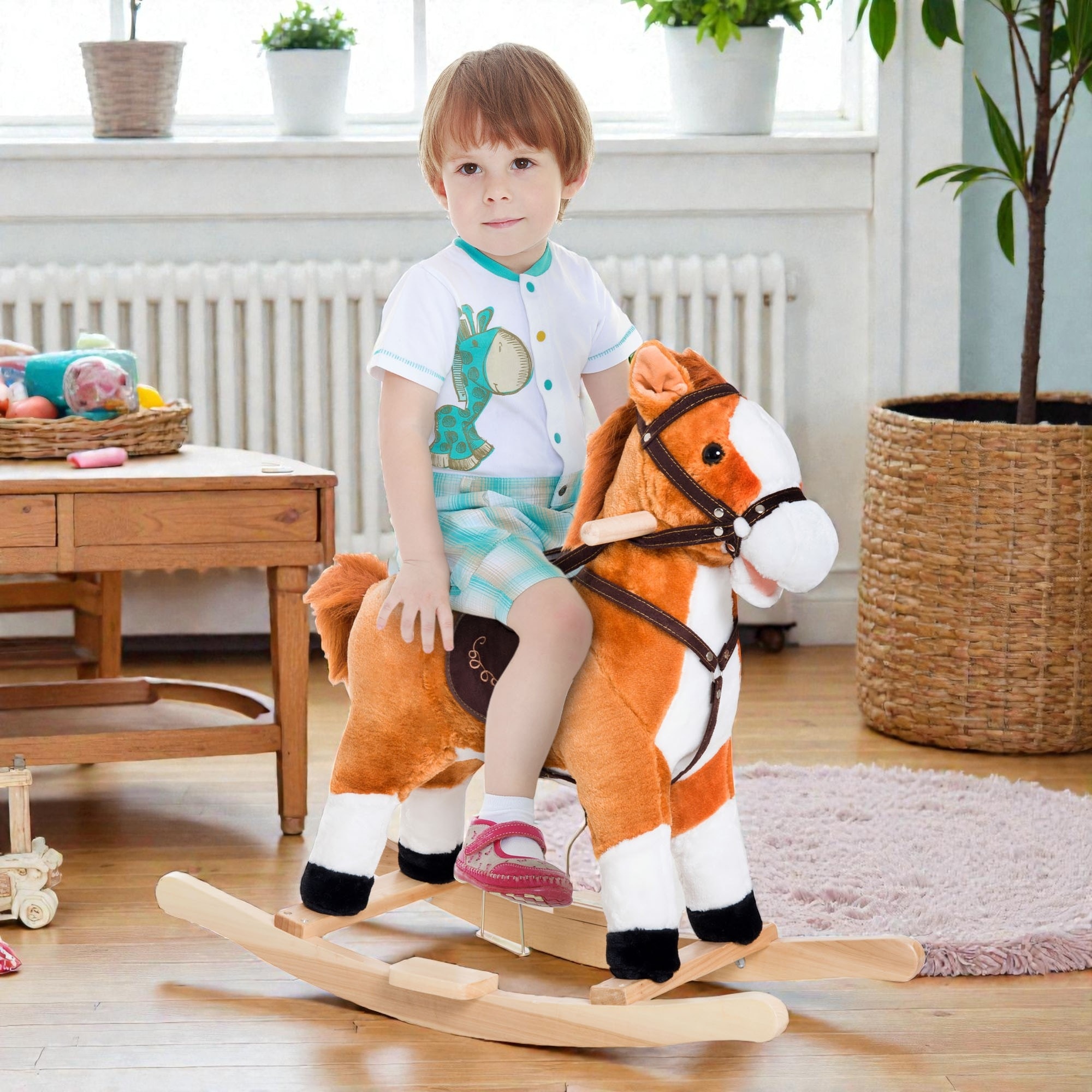 Kids Plush Rocking Horse Ride On Toy with Realistic Sounds Saddle Wooden Rocker for Kids Ages 3 Years Up