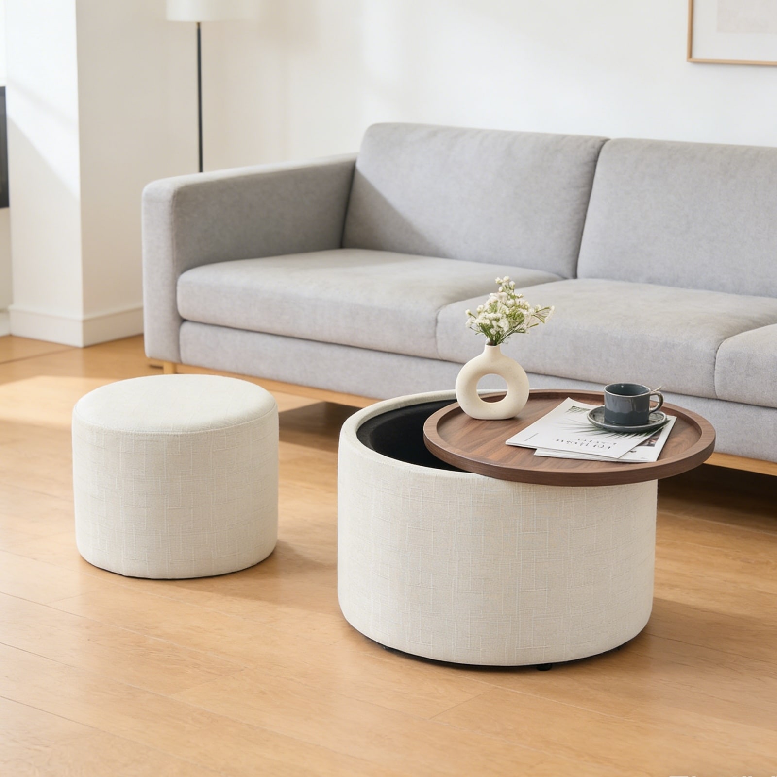 22.75" Linen Upholstered Round Storage Ottoman, End Table, Footstool