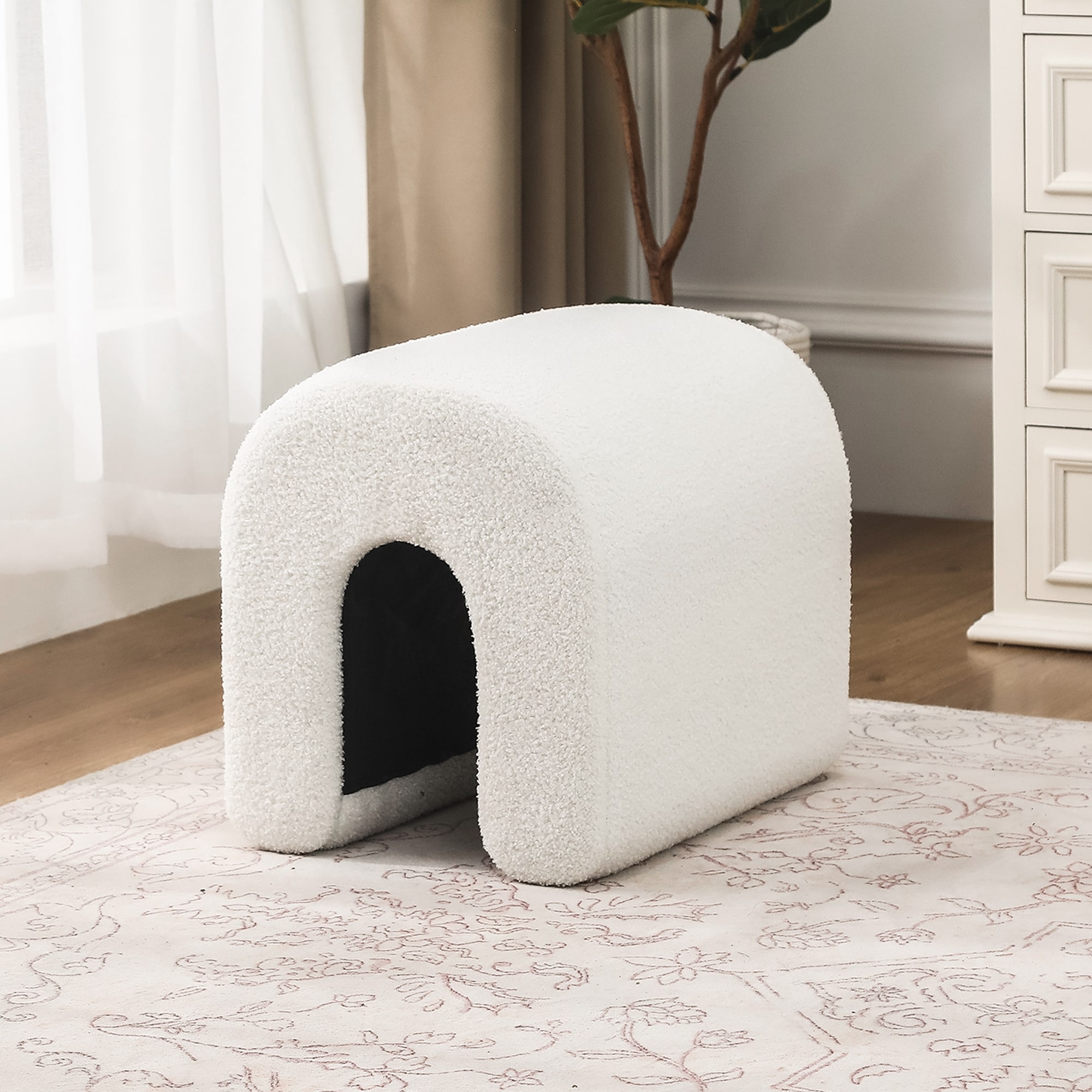 Storage Ottoman with Flip-Top Lid, Boucle Fabric & Birch Wood Legs