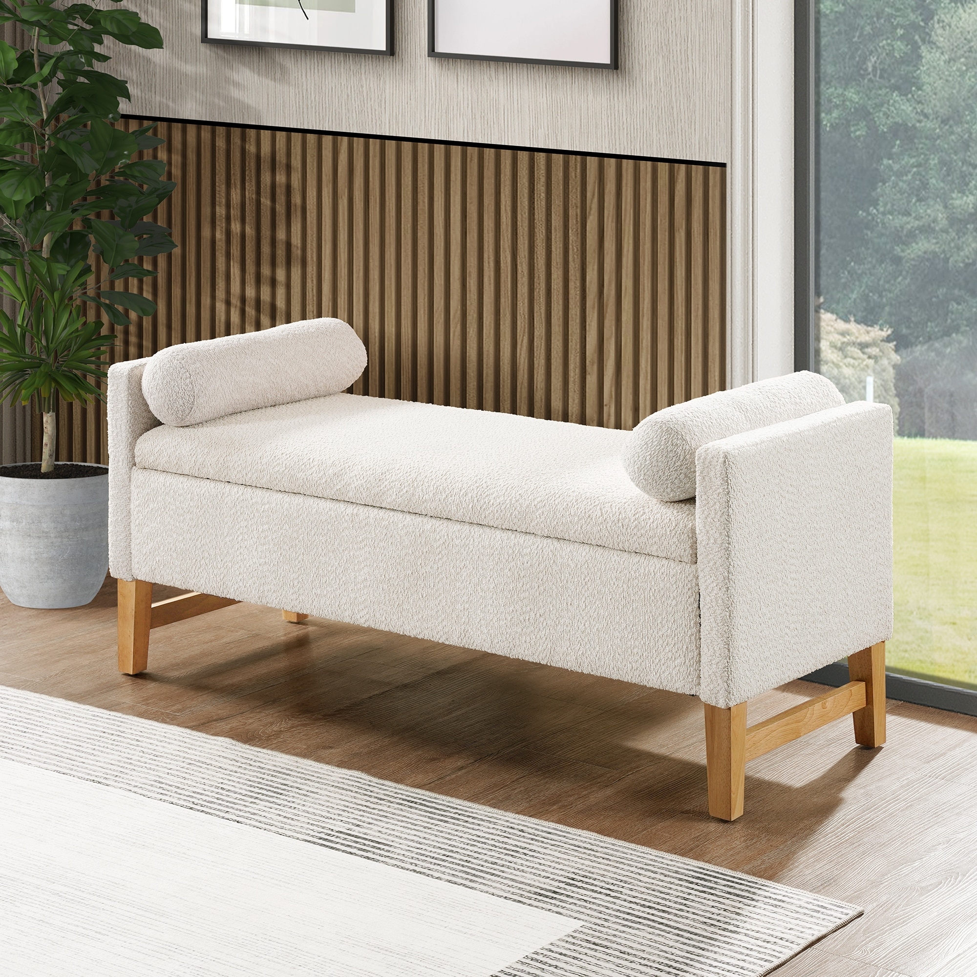Upholstered Bedroom Bench with Bouclé Fabric and Solid Wood Legs Farmhouse Bench