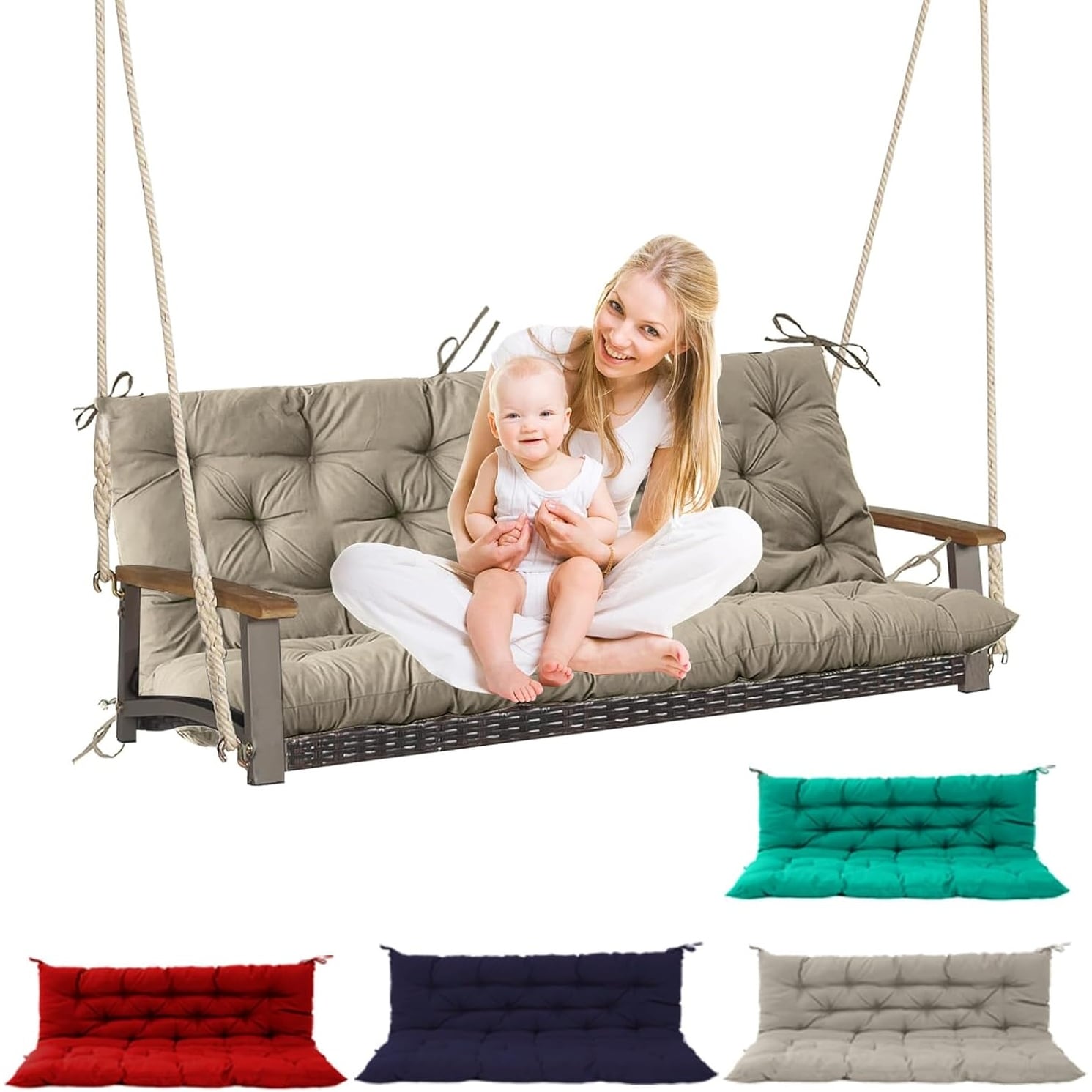 Waterproof Three-Seat Outdoor Swing Cushions with Backrest and Ties, 40x60in, Khaki