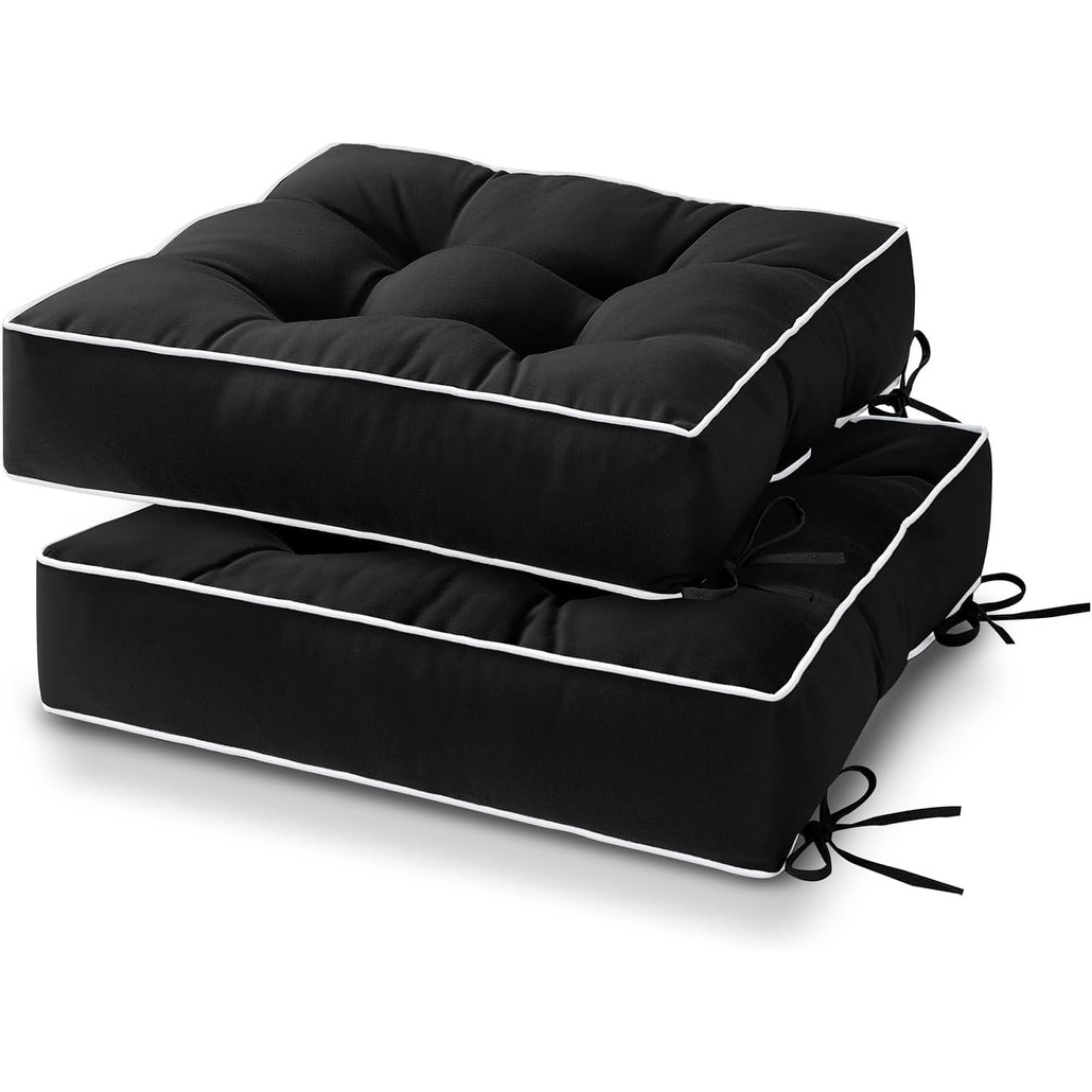 Set of 2 Tufted Outdoor Chair Cushions with Ties, Water Repellent & UV-Resistant, 19x19x5 Inch, Black