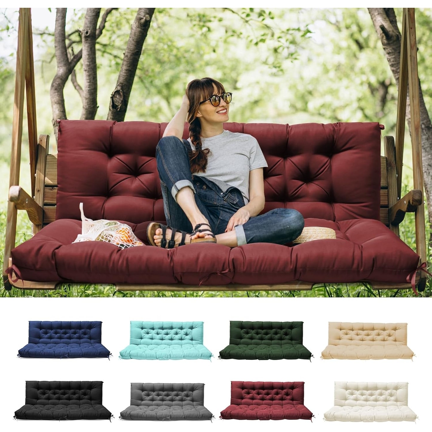 Waterproof Outdoor Swing Cushions with Backrest, 2-3 Seater Patio Bench Cushions with Ties (Red, 60x40 Inches)