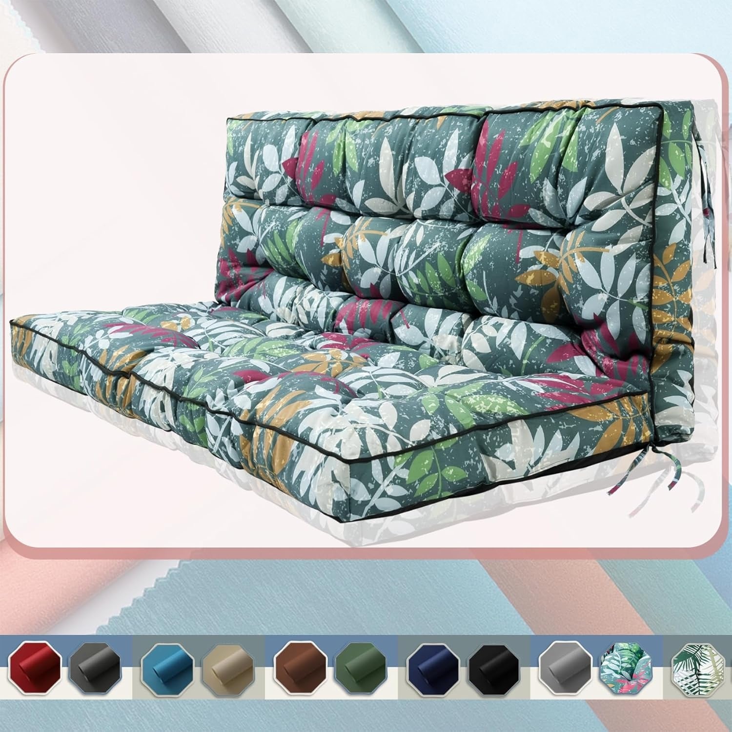 Outdoor 2-3 Seat Swing Cushion with Backrest, Thickened 4 Inch, Waterproof & Anti-Fading, Green Flower Design, 40x63 Inches