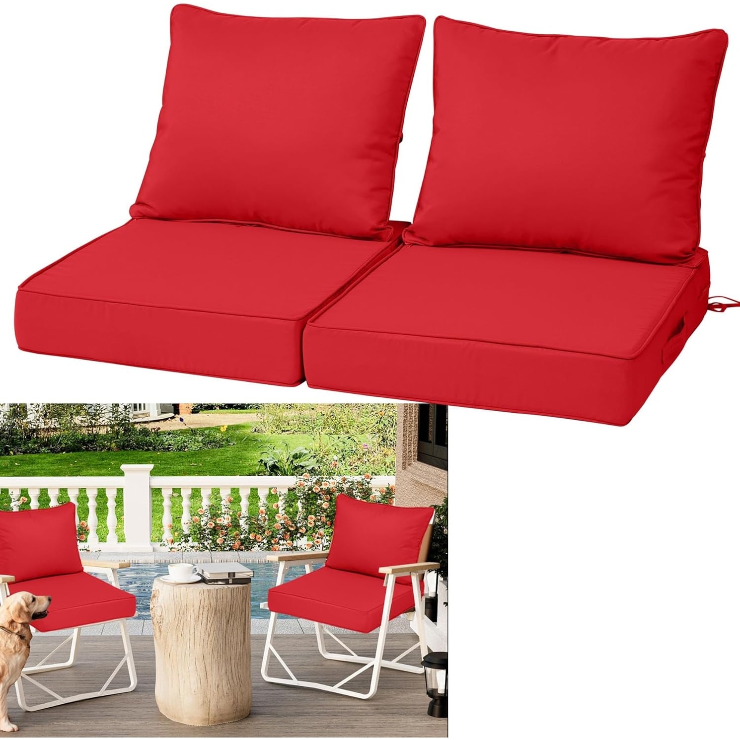 Waterproof Outdoor Deep Seat Cushions Set of 2, 24x24x4'' Fade Resistant with Removable Cover & Straps for Patio Furniture, Red