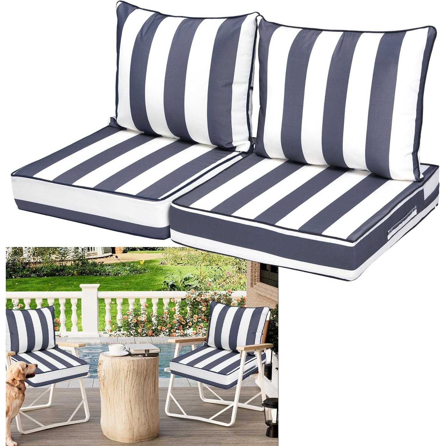 Waterproof Outdoor Deep Seat Cushions Set of 2 with Fade Resistant Cover and Straps, Blue Stripe